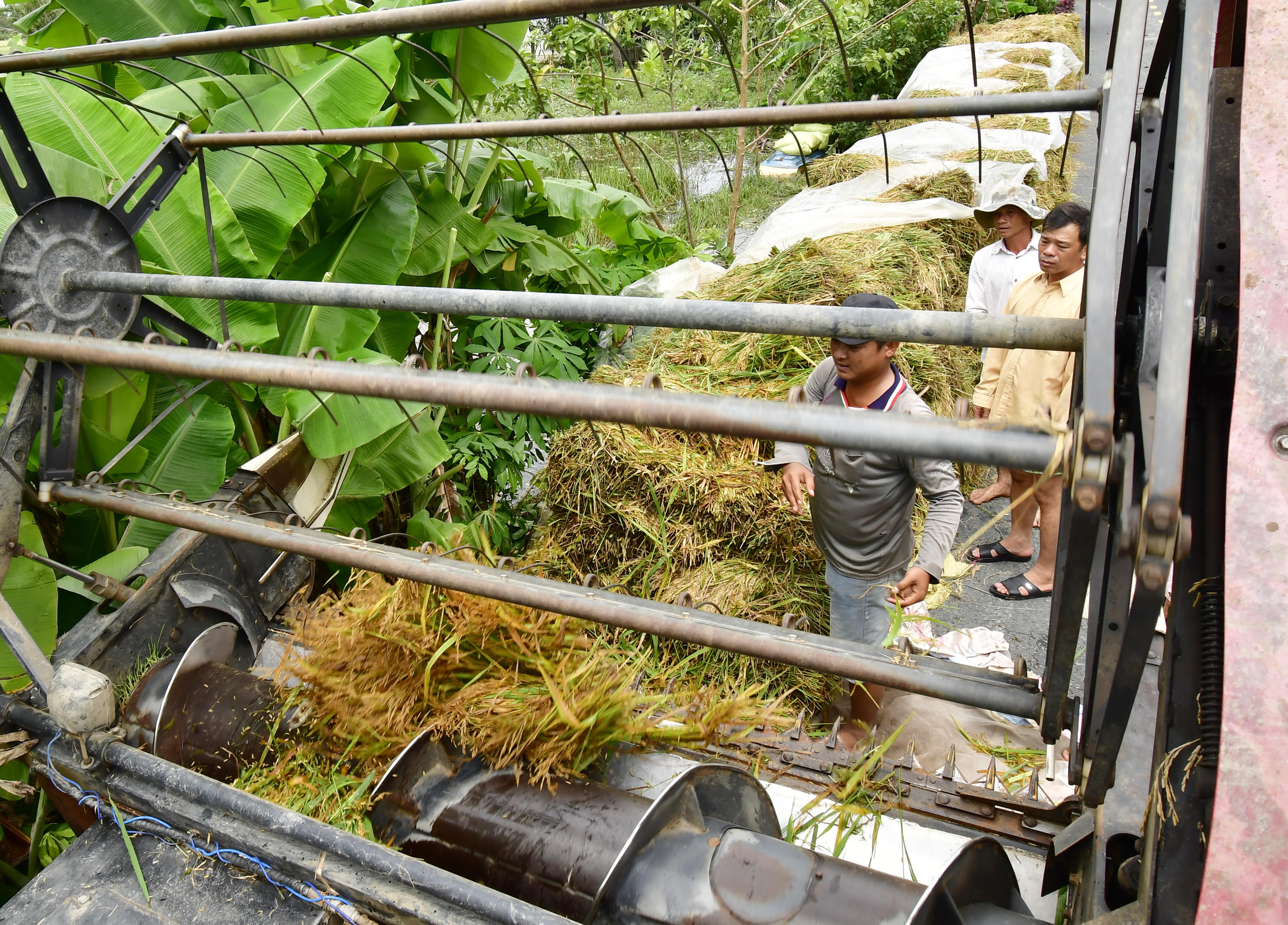 Chị Phạm Thị Út, ngụ tại ấp 4, xã Khánh Bình Đông (Trần Văn Thời, Cà Mau) không giấu được niềm vui mang cơm ra đồng cho lực lượng quân tự vệ giúp mình thu hoạch lúa. "Mang được lúa mới vào nhà là vui rồi", chị Út chia sẻ, đồng thời cũng bày tỏ nỗi lo: "Trên địa bàn không có máy suốt lúa để ra lúa hột, bởi lâu nay vùng này toàn sử dụng máy gặt đập liên hợp để thu hoạch lúa. Như vậy, lúa để vài ngày là lên mộng, hư hại…".