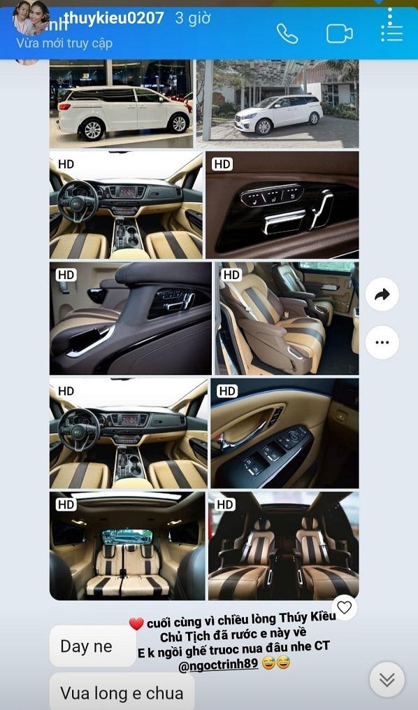 Mới đây, Thúy Kiều đã đăng tải ảnh chụp màn hình cuộc trò chuyện giữa mình và cô chủ nhỏ lên Instagram. Trong tin nhắn, Ngọc Trinh gửi loạt ảnh chụp một chiếc xế hộp trị giá gần hơn 1 tỷ đồng với lời nhắn: "Đây nè, vừa lòng em chưa?". Cô tiết lộ: "Cuối cùng vì chiều lòng Thúy Kiều, chủ tịch đã rước em này về. Em không ngồi ghế trước nữa đâu nhe chủ tịch".