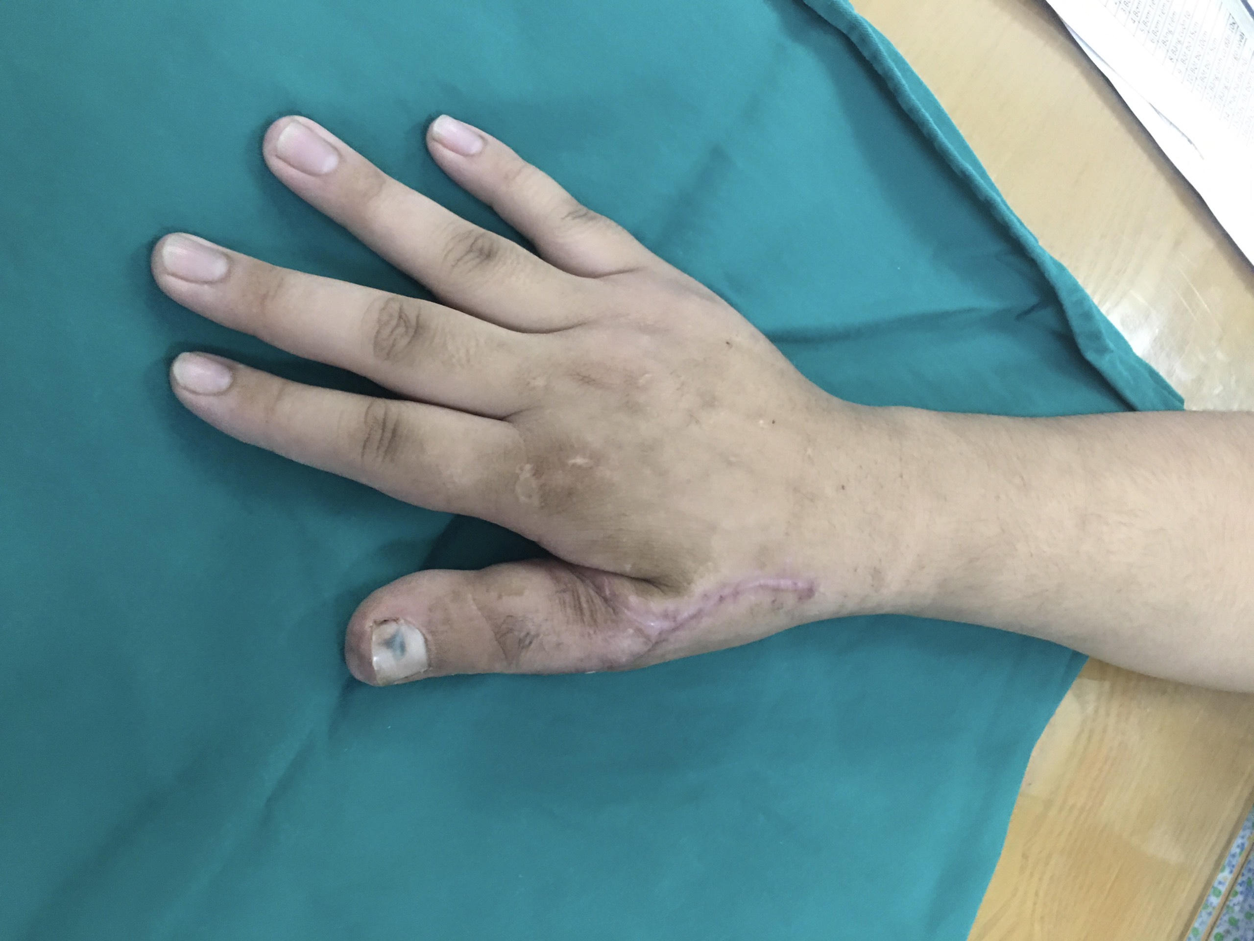 (PLVN) - Bị máy ép giấy lột toàn bộ phần da của ngón tay cái, nam thanh niên 17 tuổi được phẫu thuật ghép da, với kỹ thuật chuyển da mô mềm, không có xương.