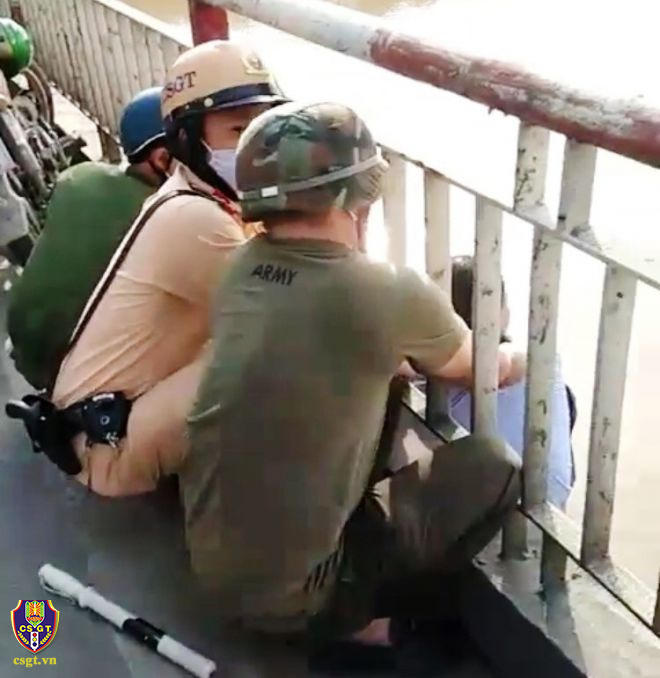 Lực lượng chức năng tiếp cận nhịp cầu số 6, vị trí nam thanh niên vừa trèo ra ngoài lan can cầu với ý định dại dột. Đại uý Nguyễn Khánh Thọ, tổ trưởng Tổ Cảnh sát cùng người dân kịp thời lao đến kéo anh này lại.