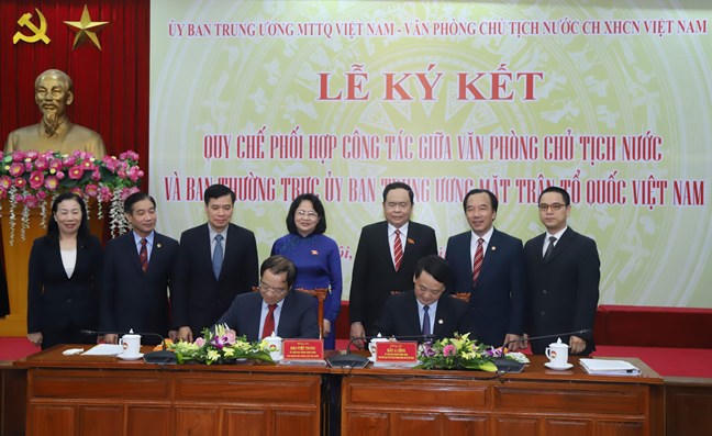 Thực hiện ý kiến chỉ đạo của Tổng Bí thư, Chủ tịch nước Nguyễn Phú Trọng, chiều nay (25/11), tại Hà Nội, UBTƯ MTTQ Việt Nam phối hợp với Văn phòng Chủ tịch nước đã tổ chức Lễ ký kết Quy chế phối hợp công tác giữa hai cơ quan.