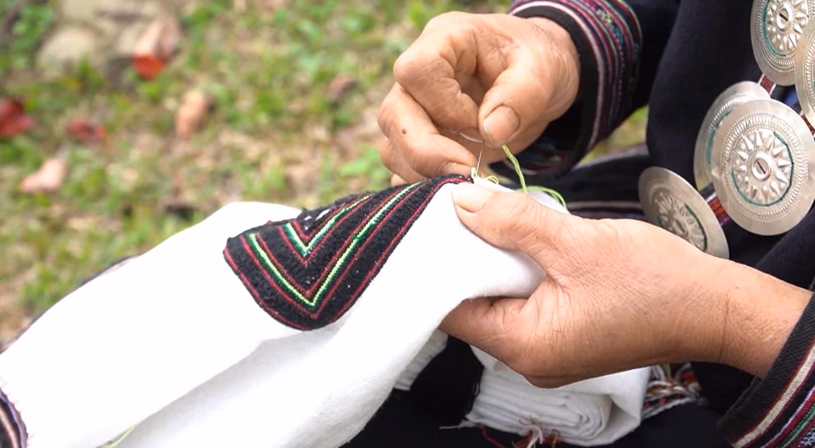 “Từ lúc 13 tuổi mẹ đã dạy tôi thêu áo, chấm sáp ong. Đến khoảng 18 tuổi thì làm thành thạo. Phải khâu từng tí, thêu theo đường từ cuốn chân, áo váy cho đến khăn đội đầu. Nếu làm tranh thủ thì khoảng một năm mới xong một bộ, còn nếu làm liên tục cũng phải bốn tháng”, chị Nhoàn chia sẻ.