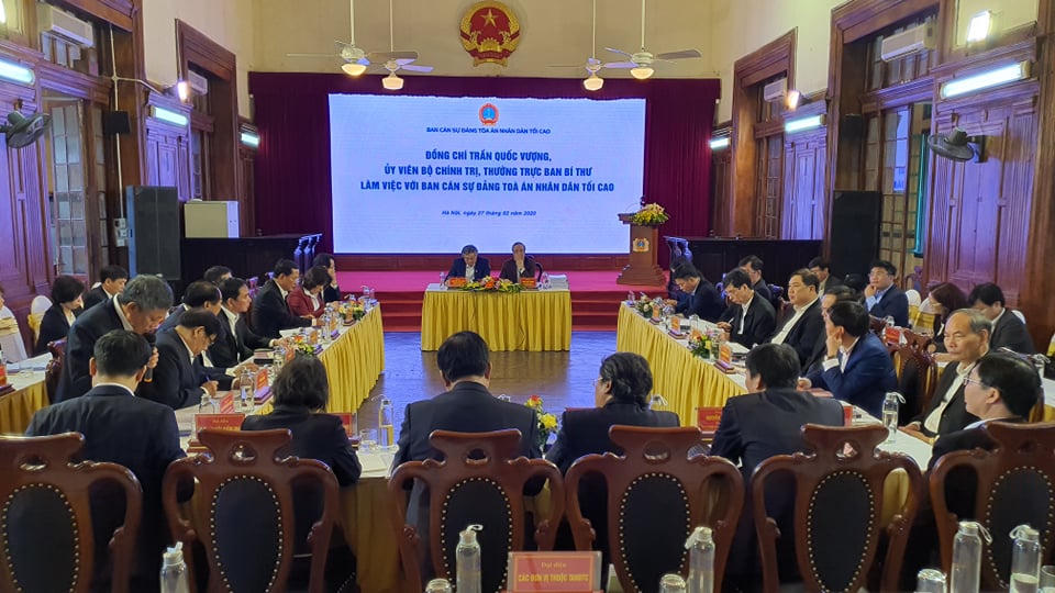 Ngày 27/2, đồng chí Trần Quốc Vượng, Ủy viên Bộ Chính trị, Thường trực Ban Bí thư đã có buổi làm việc với Ban Cán sự Đảng TANDTC về kết quả thực hiện Nghị quyết Đại hội XII và triển khai thực hiện Chỉ thị 35-CT/TW của Bộ Chính trị.