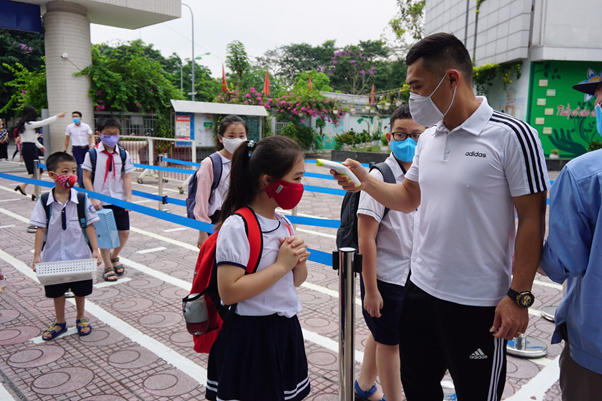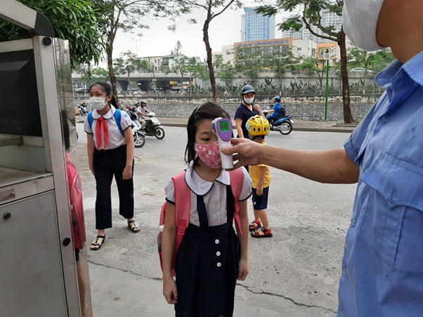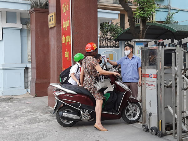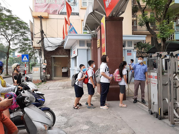 Trường tiểu học Quan Hoa ( Yên Hòa, Cầu Giấy) tiến hành đo thân nhiệt ngay tại cổng trường