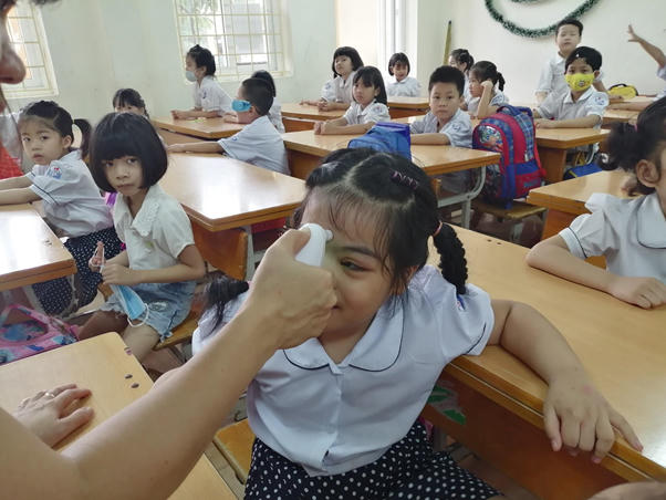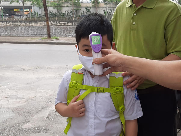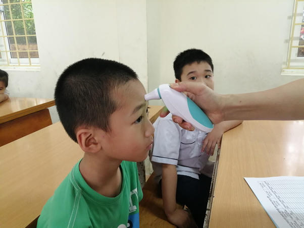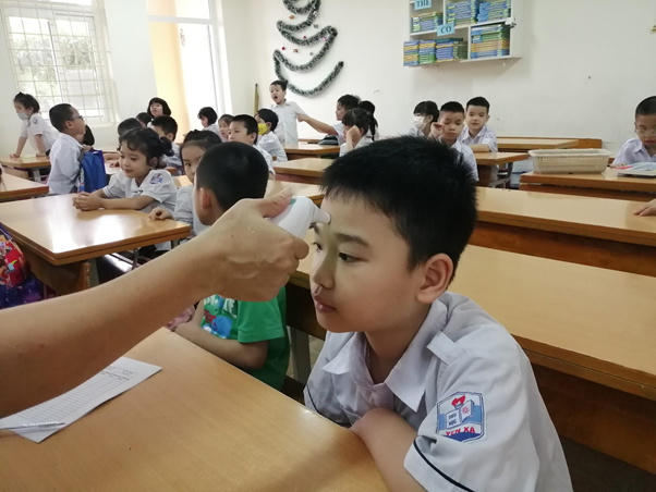 Trường tiểu học Yên Xá ( Tân Triều, Thanh Trì, Hà Nội) tiến hành đo thân nhiệt tại lớp học cho học sinh