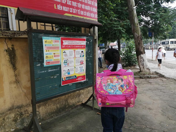 Biển báo, bảng chỉ dẫn phòng, chống dịch Covid- 19 được dán hai bên trường nổi bật tại trường mầm non Cổ Nhuế ( Từ Liêm, Hà Nội)