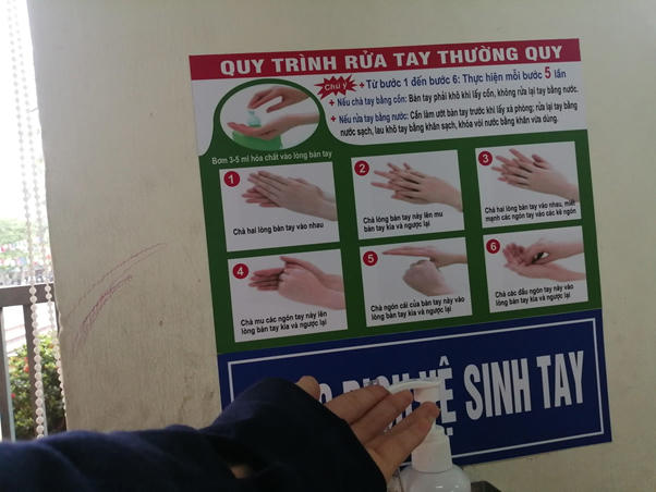 Dung dịch rửa và hướng dẫn bé rửa tay được đặt bên trong trường
