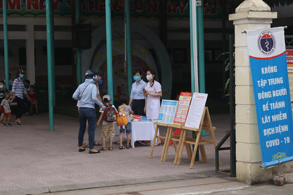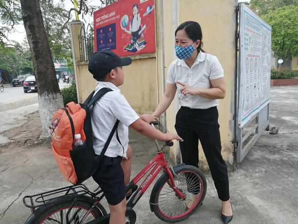 Thầy, cô, đứng ngoài cổng hướng dẫn học sinh. Bé ngay lập tức được nhắc nhở nếu không đeo khẩu trang khi vào trường
