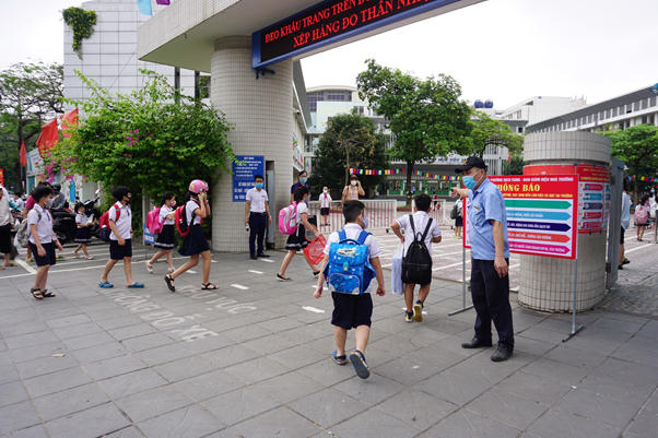 Bảo vệ đo thân nhiệt và xịt dung dịch rửa tay cho học sinh từ cổng trường tiểu học Dịch Vọng B ( Dịch Vọng Cầu Giấy)