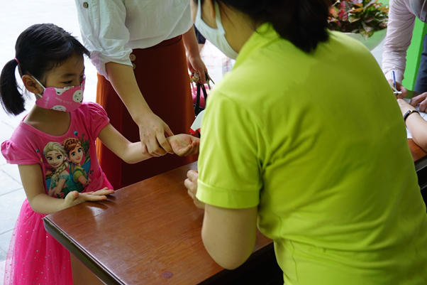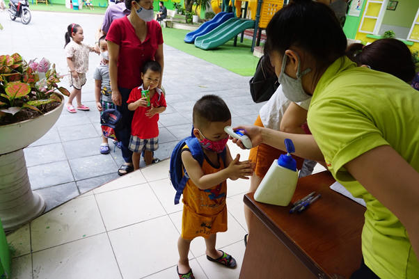 Tại trường mầm non Hoa Mai ( Quan Hoa, Cầu Giấy) tiến hành rửa tay, đo thân nhiệt cho bé