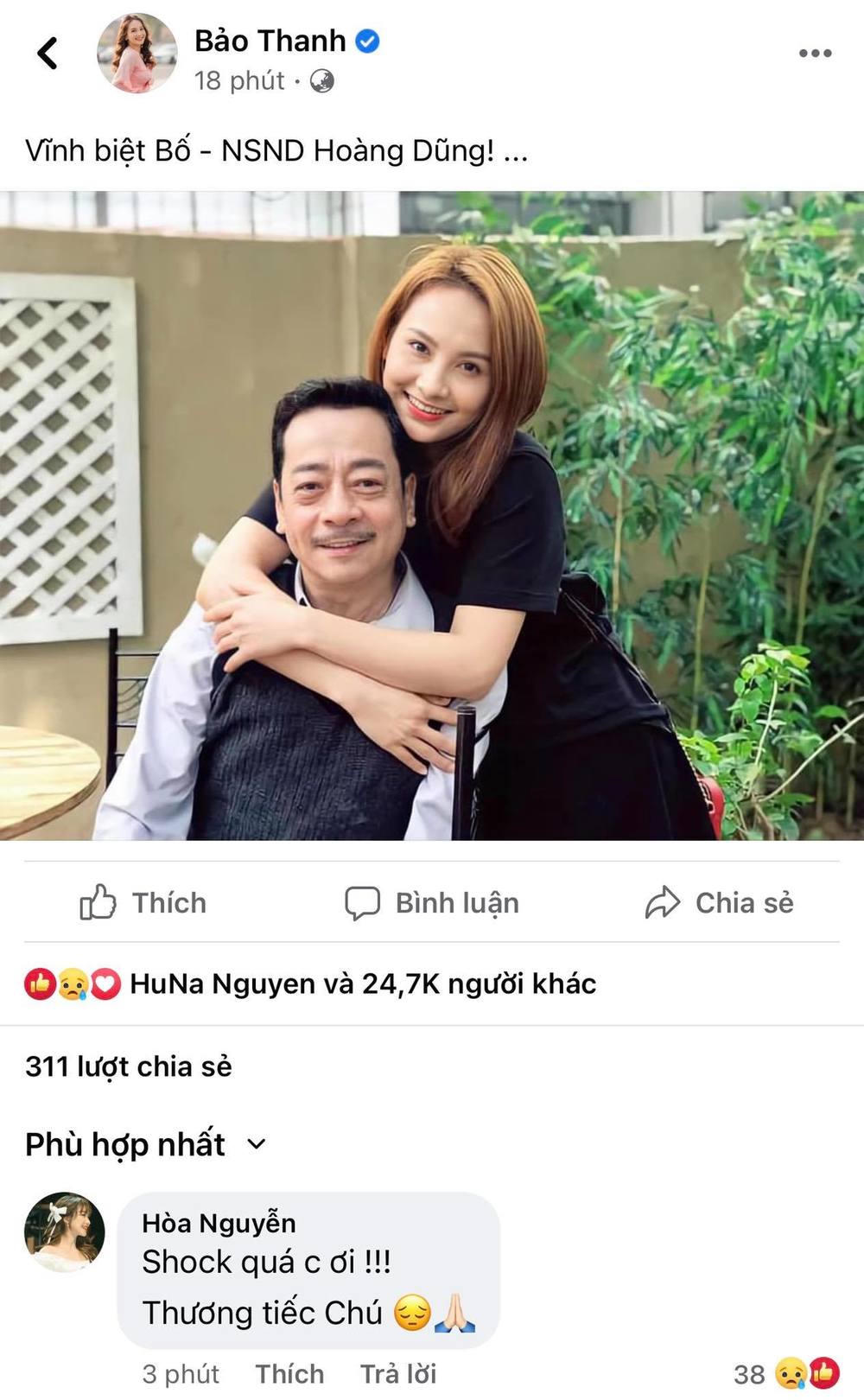 Hàng loạt sao Việt như Quốc Trường, Bảo Thanh, Khắc Hưng, Vũ Khắc Tiệp, NSND Hồng Vân... cũng bày tỏ niềm tiếc thương trước sự ra đi của NSND Hoàng Dũng.