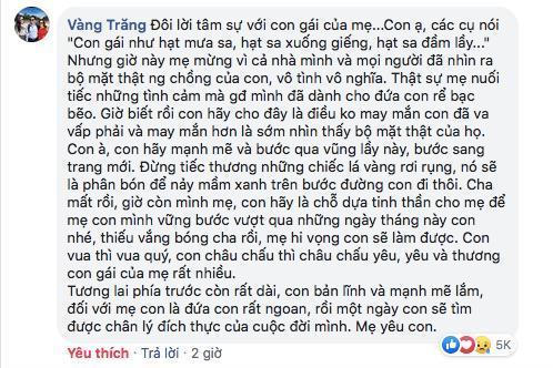 Mẹ Âu Hà My cũng cho biết bà vô cùng tiếc nuối vì cả gia đình đã dành nhiều yêu thương cho con rể bạc bẽo. Ngay lúc này, mẹ Âu Hà My động viên con gái hãy cảm thấy may mắn vì đã nhận ra bộ mặt thật của người chồng. Sâu cay hơn, người mẹ tần tảo của Hà My viết tiếp: