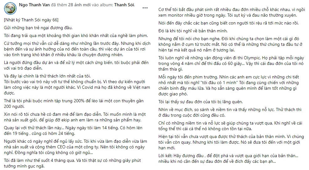 "Tôi đang trải qua khoảng thời gian khó khăn nhất của nghề làm phim. Khi dịch bệnh đến và sự ảnh hưởng của nó đến toàn cầu, thì việc dự án của tôi rơi vào tình trạng khó khăn ở nhiều khâu là chuyện đương nhiên. Là người đứng đầu dự án và để xử lý một cách ứng biến, tôi buộc phải đến với vai trò đạo diễn. Tôi bước vào vai trò này với tư thế không chuẩn bị. Vì theo dự kiến người làm công việc này là một người khác. Vì Covid mà họ đã không về Việt Nam được. Xin nói rõ tôi chưa hề có đam mê để làm đạo diễn." - Nữ diễn viên nói về lý do khiến bản thân buộc phải chấp nhận vai trò mới là do dịch bệnh.