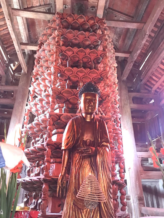 Những nếp gỗ đã ngả màu thời gian. Mái ngói xô nghiêng, rêu phong bám phủ. Khách thập phương đến tham quan và chiêm bái bước chân lên bậc thềm với những phiến đá cổ mát lạnh.