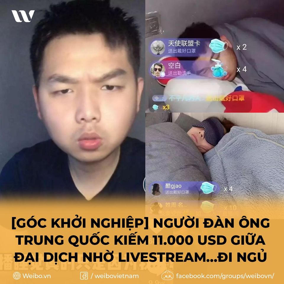 QQ News đưa tin, do ảnh hưởng từ dịch Covid-19, chính phủ Trung Quốc khuyến cáo người dân nên tự cách ly trong nhà, tránh tụ tập chốn đông người để giảm nguy cơ lây nhiễm virus. Các hoạt động kinh doanh sản xuất phần nào bị đình trệ, nhưng riêng lĩnh vực livestream trên các nền tảng xã hội lại phát triển mạnh mẽ. Có rất nhiều cách để kiếm tiền nhờ livestream như bán quần áo, mỹ phẩm, đồ ăn hay thậm chí chỉ cần...ngủ!