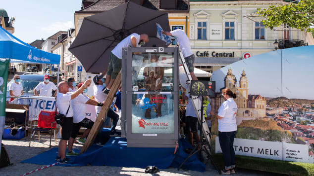 Chỉ mặc quần bơi, Josef Koeberl (42 tuổi) vùi mình dưới 1.800 kg đá lạnh ở quảng trường chính của thị trấn Melk, phía tây Vienna, hôm 5/9 với hy vọng lập kỷ lục thế giới mới về ngâm mình trong đá lâu nhất.