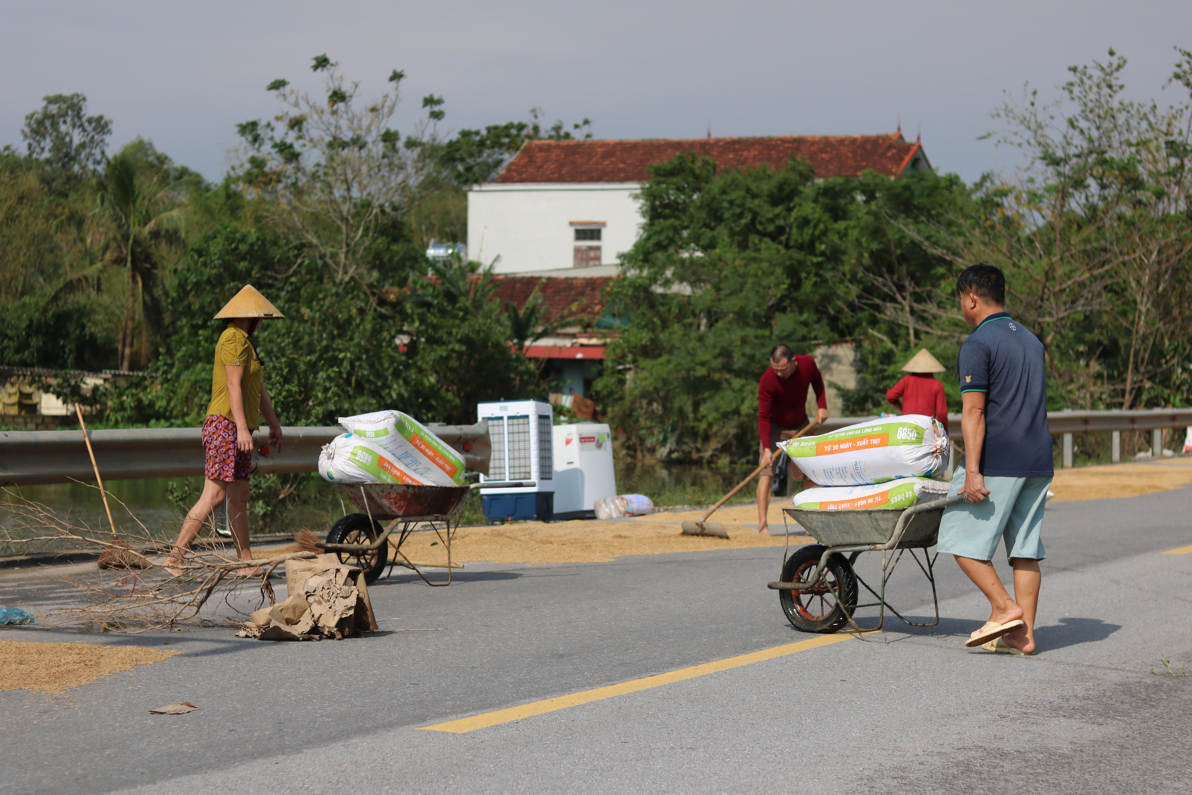 Người dân xã Hưng Thủy, huyện Lệ Thủy cố gắng tranh thủ thời tiết nắng để phơi lúa đã bị ngâm nước những ngày qua