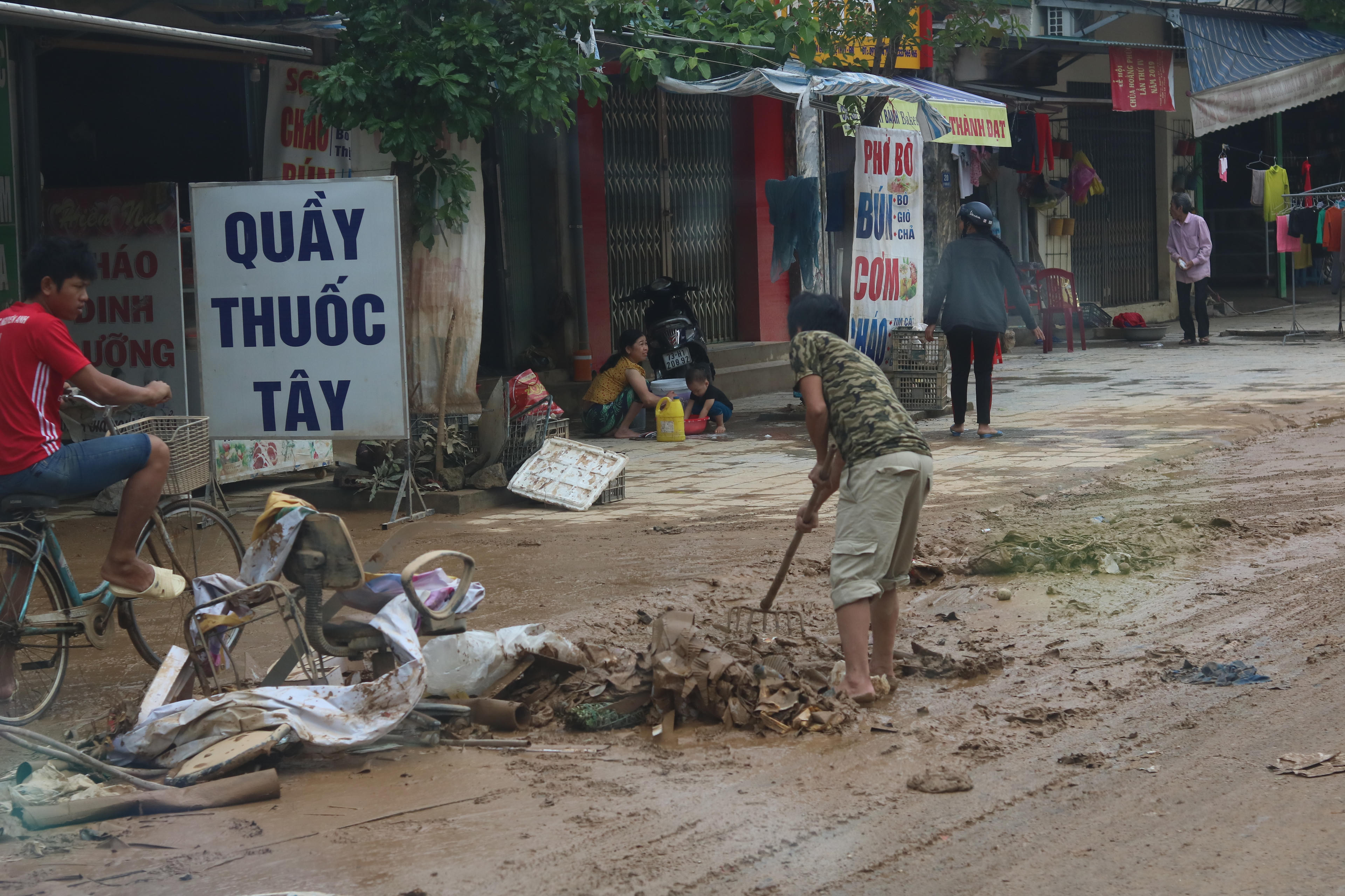 Nhiều khu vực trung tâm huyện Lệ Thủy nước lũ vừa rút thì bùn non, rác thải như 'bủa vây".