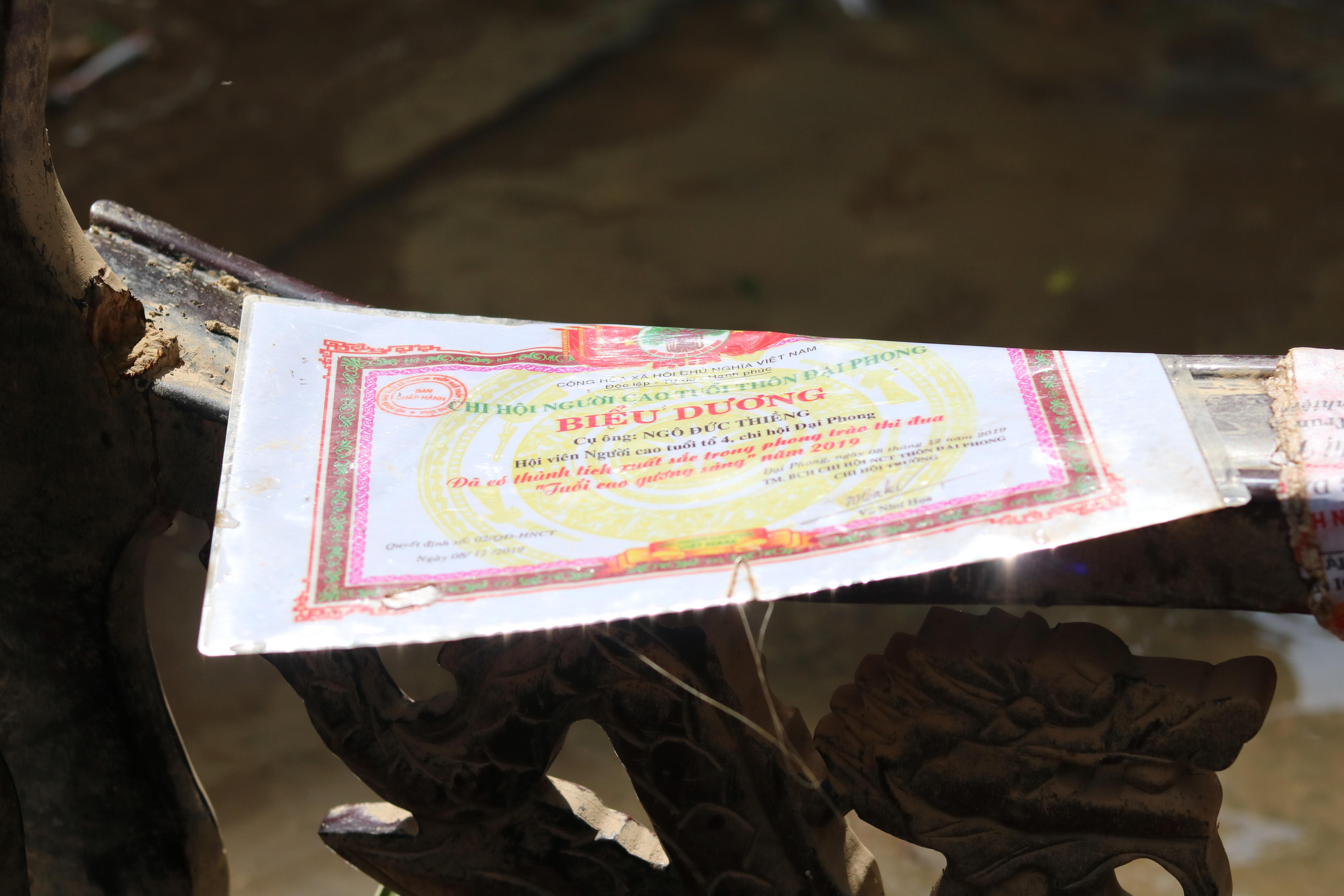 Những tờ giấy khen biểu dương tranh thủ được phơi khô khi trời có nắng.