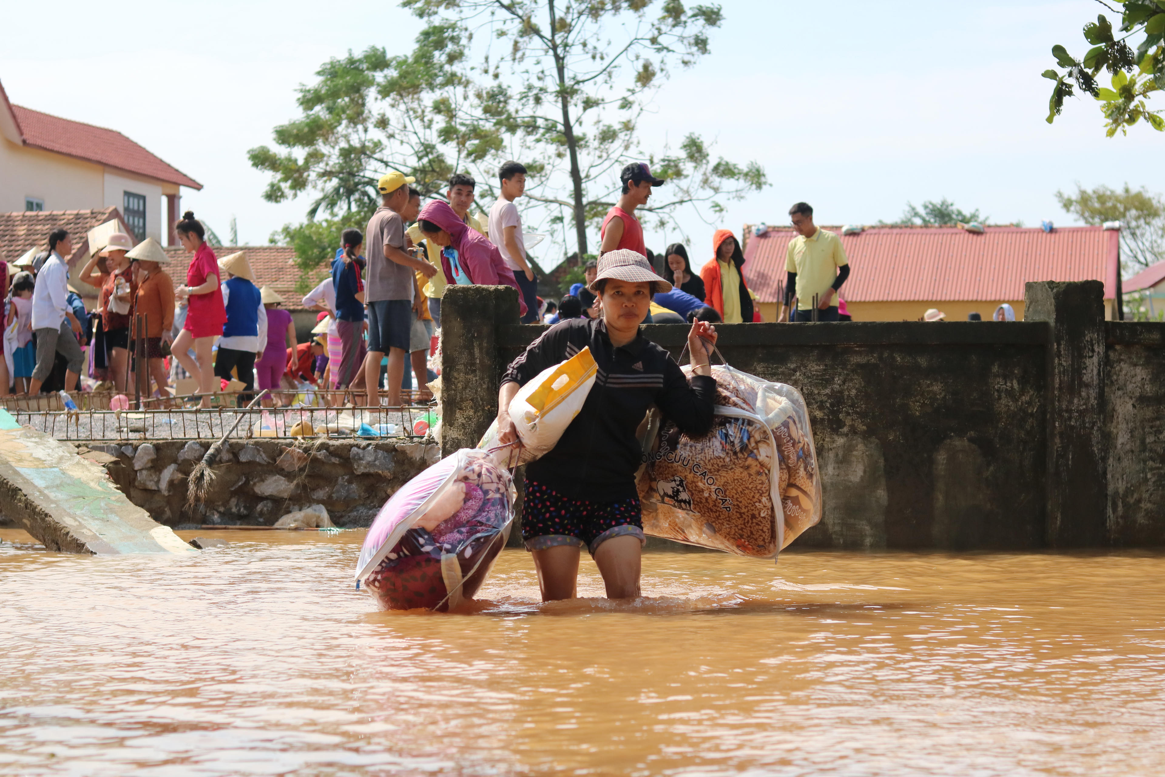 Người dân đến nhận hàng cứu trợ của các đoàn thiện nguyện bất chấp khó khăn để đi vào từng thôn xóm nhỏ.