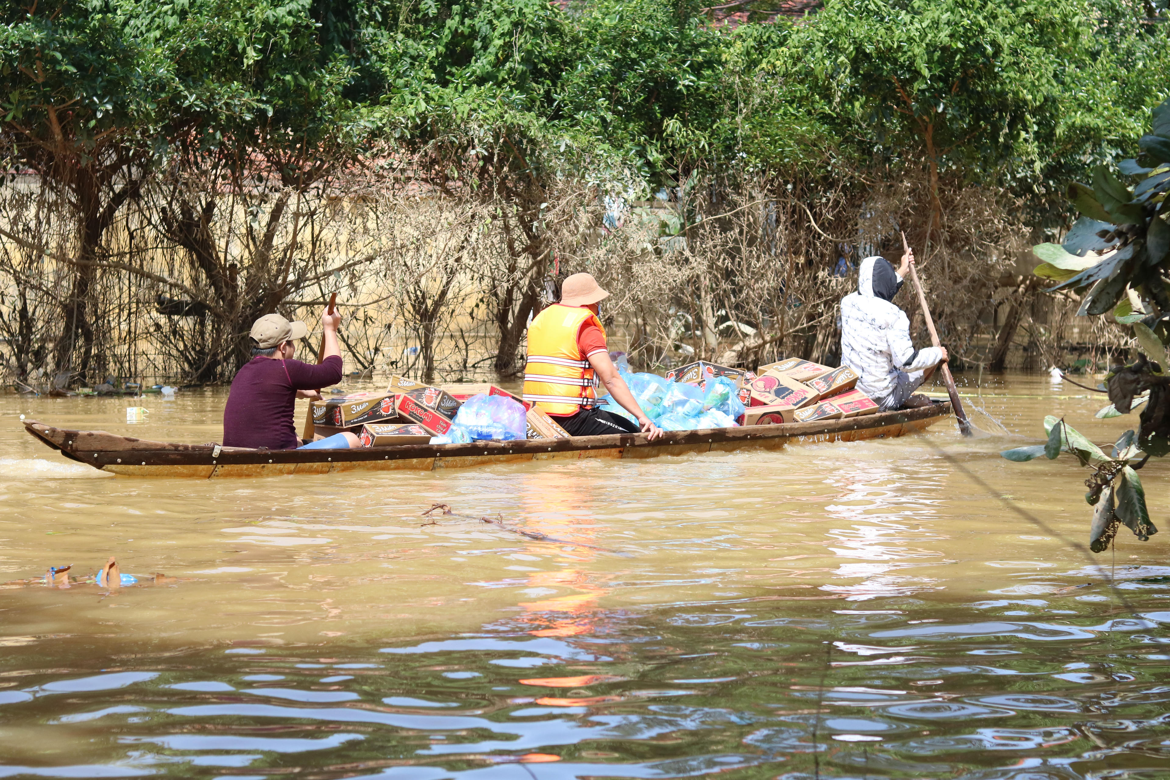 Những thanh niên trai tráng tại vùng ngập sâu thuộc đội 9 thôn Đại Phong, xã Phong Thủy đại diện ra nhận nhu yếu phẩm để về phát cho bà con không thể di chuyển ra vì nước ngập sâu.
