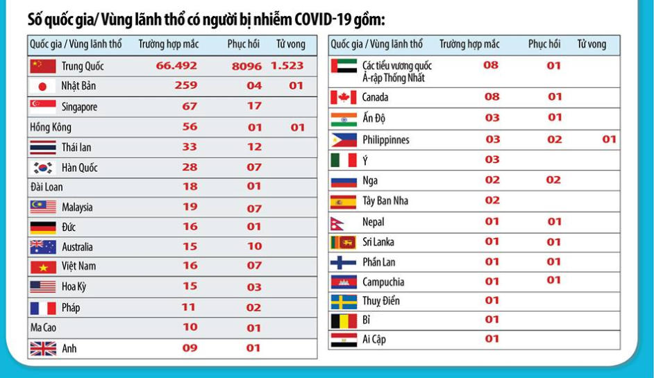 Tính đến 8h hôm nay, 15/2, có 67.100 trường hợp mắc Covid - 19, trong đó có 608 trường hợp ngoài Trung Quốc. Có 8.181 ca đã phục hồi và 1.526 ca tử vong.