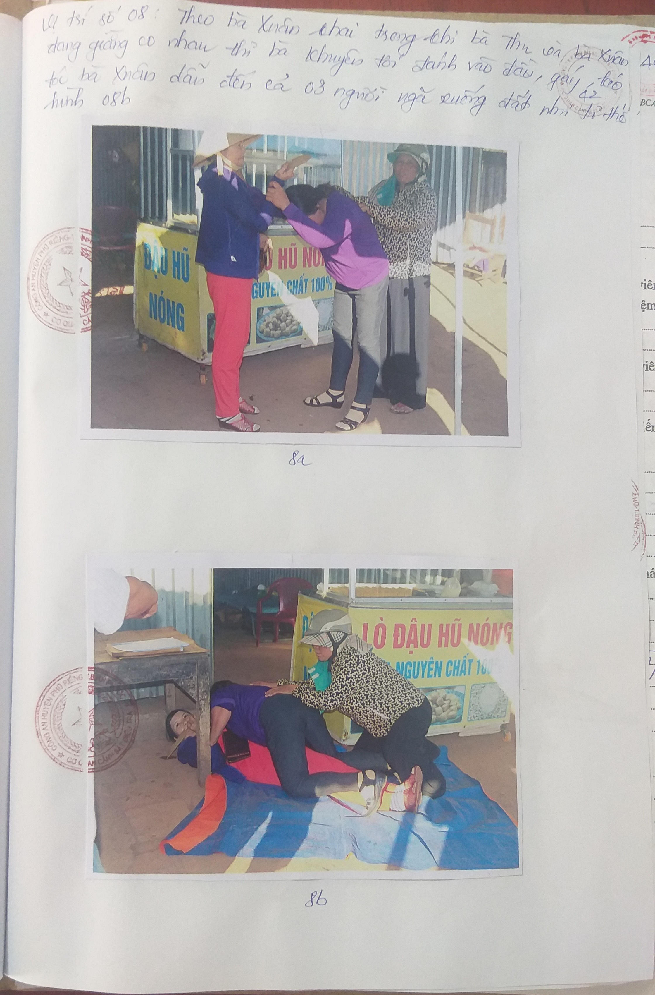 Trong lúc bà Xuân và bà Thu xô xát, bà Khuyên chạy từ phía sau đến, dùng tay đấm vào gáy của bà Xuân và túm tóc của bà Xuân khiến cả 03 người bị ngã nằm đè lên nhau, làm vỡ 01 tủ kính bán đậu kế bên.