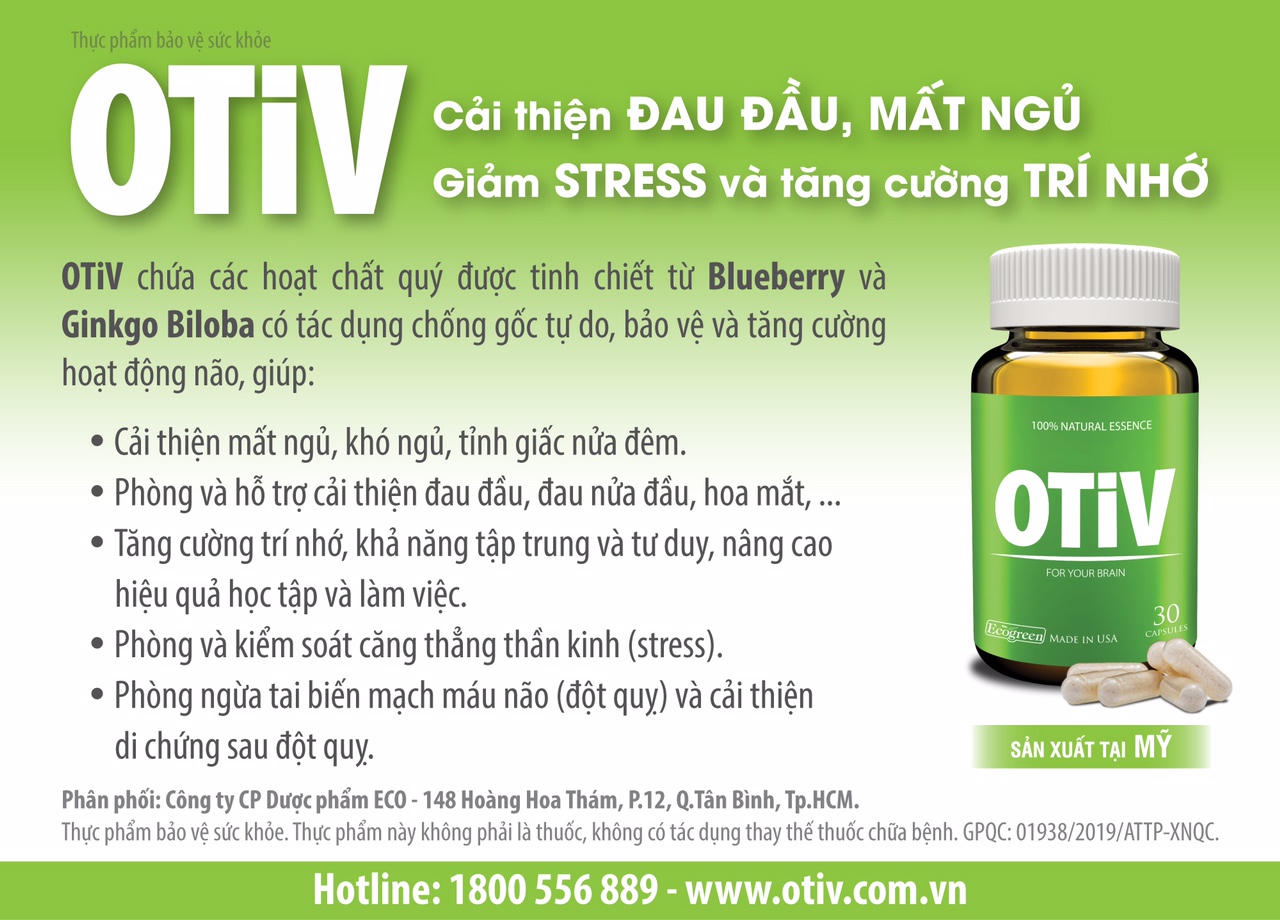 Bằng công nghệ chiết xuất hiện đại, các nhà khoa học Mỹ đã chứng minh 2 hoạt chất Anthocyanin và Pterostilbene từ quả Blueberry (vùng Bắc Mỹ) có khả năng vượt qua hàng rào máu não, tiến sâu vào lòng mạch máu “cân bằng” các gốc tự do; ngăn chặn quá trình hình thành mảng xơ vữa, huyết khối; đồng thời tăng cường vận chuyển oxy và dưỡng chất lên não, giảm căng thẳng/stress. Khi Blueberry được kết hợp thêm Ginkgo Biloba (trong sản phẩm OTiV) sẽ giúp tăng thêm hiệu quả chăm sóc não bộ, cải thiện mất ngủ tốt nhất.