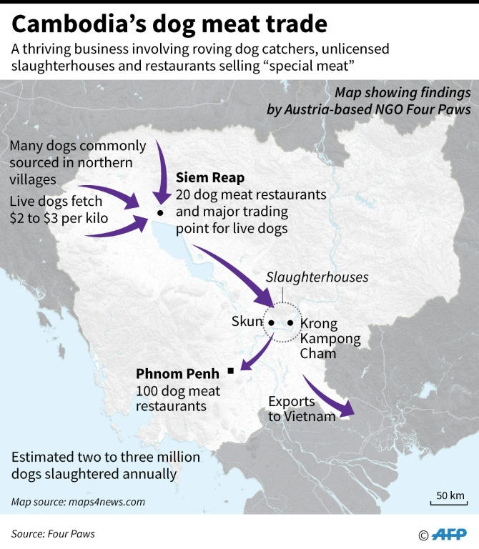 Những người buôn bán chó, những lò giết mổ không có giấy phép và nhiều nhà hàng tồn tại ở các thành phố của Campuchia.