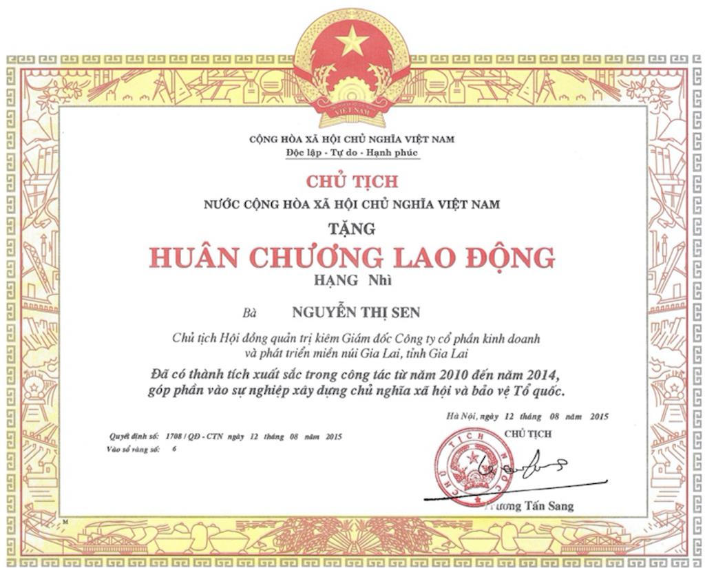 Riêng cá nhân bà Nguyễn Thị Sen là Chủ tịch HĐQT kiêm Giám đốc Công ty cũng được lãnh đạo các doanh nghiệp tín nhiệm bầu làm Chủ tịch Hiệp hội Doanh nghiệp tỉnh Gia Lai hơn 20 năm. Bà được Chủ tịch nước tặng Huân chương Lao động Hạng Ba và Hạng Nhì, được Thủ tướng Chính phủ tặng danh hiệu chiến sĩ thi đua toàn quốc.