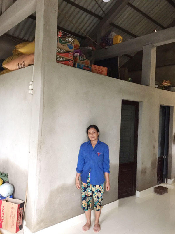 Với gia đình chị Dương Thị Trình, 15 triệu đồng vay từ NHCSXH cộng với chút tiền dành dụm cất được căn nhà vượt lũ. “Có cái căn nhà này cũng may có cái chỗ bước lên mà trốn chứ không thôi mạ con là cũng không biết đứng chỗ mô mà nương tựa, cũng may mắn mà lên, có chỗ bỏ áo quần mà đựng cái bếp, nấu cái cháo mà ăn, không thôi là vất vả trôi hết luôn”, chị kể. Để rồi khi lũ về căn nhà đó lại càng quý với một thôn có 90% các gia đình có nhà bị ngập trong nước. Toàn xã bị cô lập nhiều ngày. Nhà ngập thấp nhất cũng cao đến 2/3 tường, nhà cao nhất thì lút mái. Chính vì vậy, căn nhà không chỉ là chỗ trú ẩn của gia đình chị còn mở cửa cho nhiều bà con làng xóm thôn Mỹ Hòa, xã Sơn Thủy, huyện Lệ Thủy trú ngụ qua những ngày mưa lũ.
