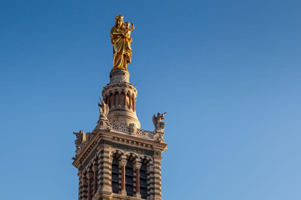 Cái tên “Notre Dame de la Garde” mang ý nghĩa là “Đức mẹ hằng cứu giúp”, thể hiện niềm tin tuyệt đối vào sự che chở của Đức Mẹ Đồng Trinh. Vì thế mà trên đỉnh cao vót của nhà thờ đã được cho xây dựng một bức tượng Đức Mẹ hai tay bồng Chúa cao Jesus hơn 11 mét và được dát gần 30 ngàn lá vàng. Đây không chỉ là tín ngưỡng của người dân nơi đây mà còn là một điển vô cùng đặc biệt thu hút bất kỳ ánh mắt nào đến với nhà thờ Notre Dame de la Garde.