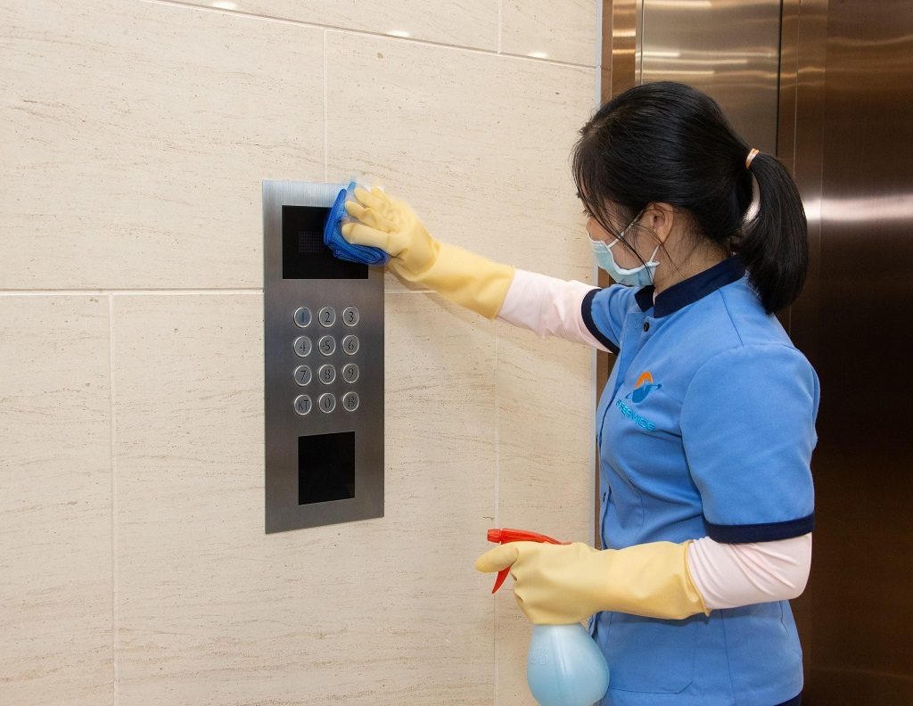 Tại các khu vực giao thông chính, nhân viên Sunshine Service thường xuyên lau chùi bằng dung dịch sát khuẩn ở tất cả vị trí nút bấm thang máy và hệ thống cửa ra vào, cửa kính.