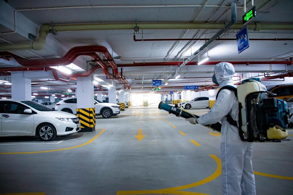 Khu vực tầng hầm được phun thuốc khử trùng nhằm đảm bảo tối đa sự an toàn cho người dân sinh sống trong tòa nhà của Sunshine Homes.