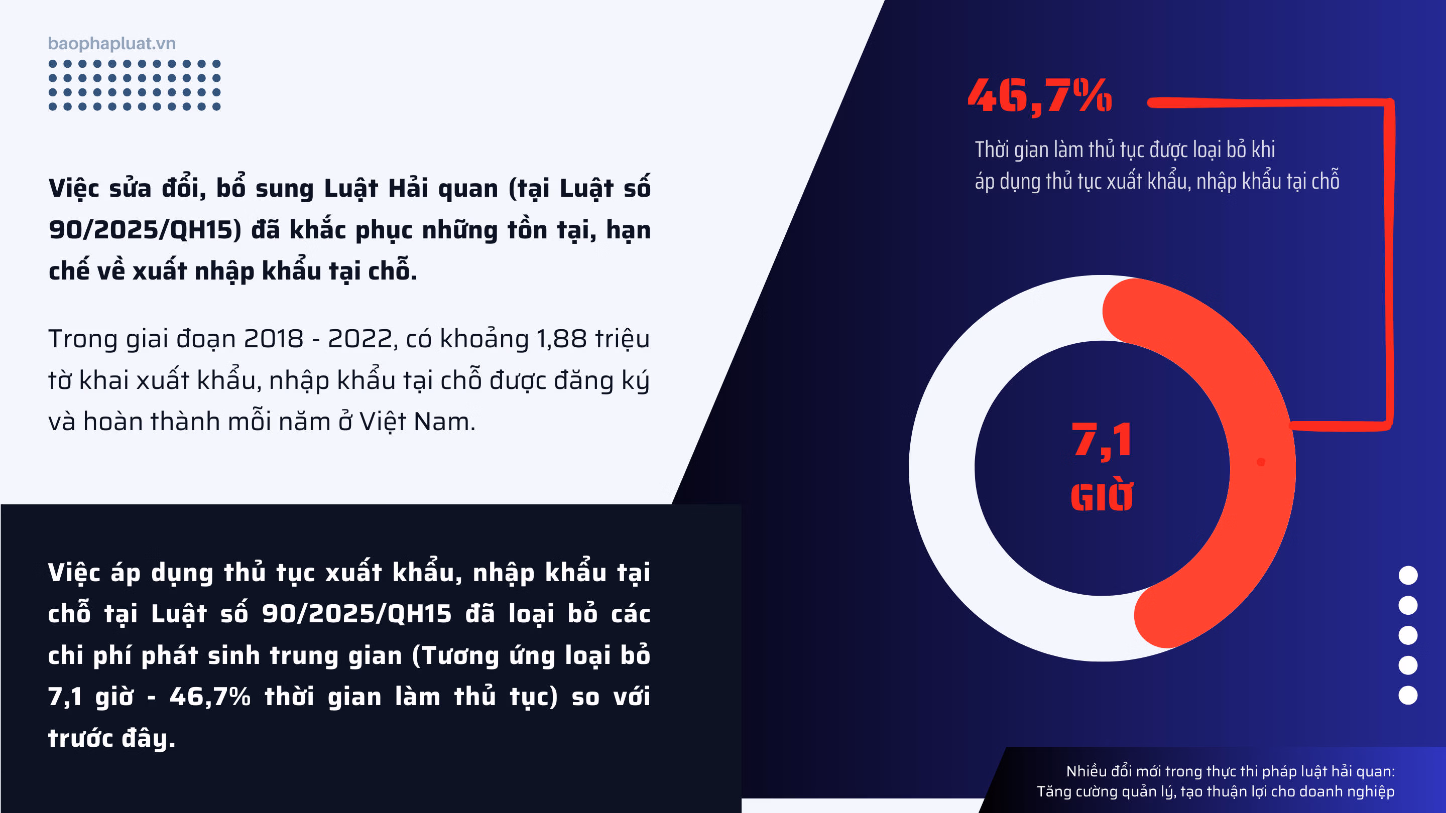 Với khoảng 1,88 triệu tờ khai xuất khẩu, nhập khẩu tại chỗ được đăng ký và hoàn thành mỗi năm ở Việt Nam (số liệu trung bình giai đoạn 2018 – 2022), chi phí và thời gian làm thủ tục hải quan được tiết kiệm nhờ vào việc sửa đổi, bổ sung Luật Hải quan là một con số không hề nhỏ, tạo thuận lợi cho hoạt động xuất nhập khẩu, đặc biệt trong bối cảnh Việt Nam ngày càng hội nhập sâu rộng vào nền kinh tế thế giới.