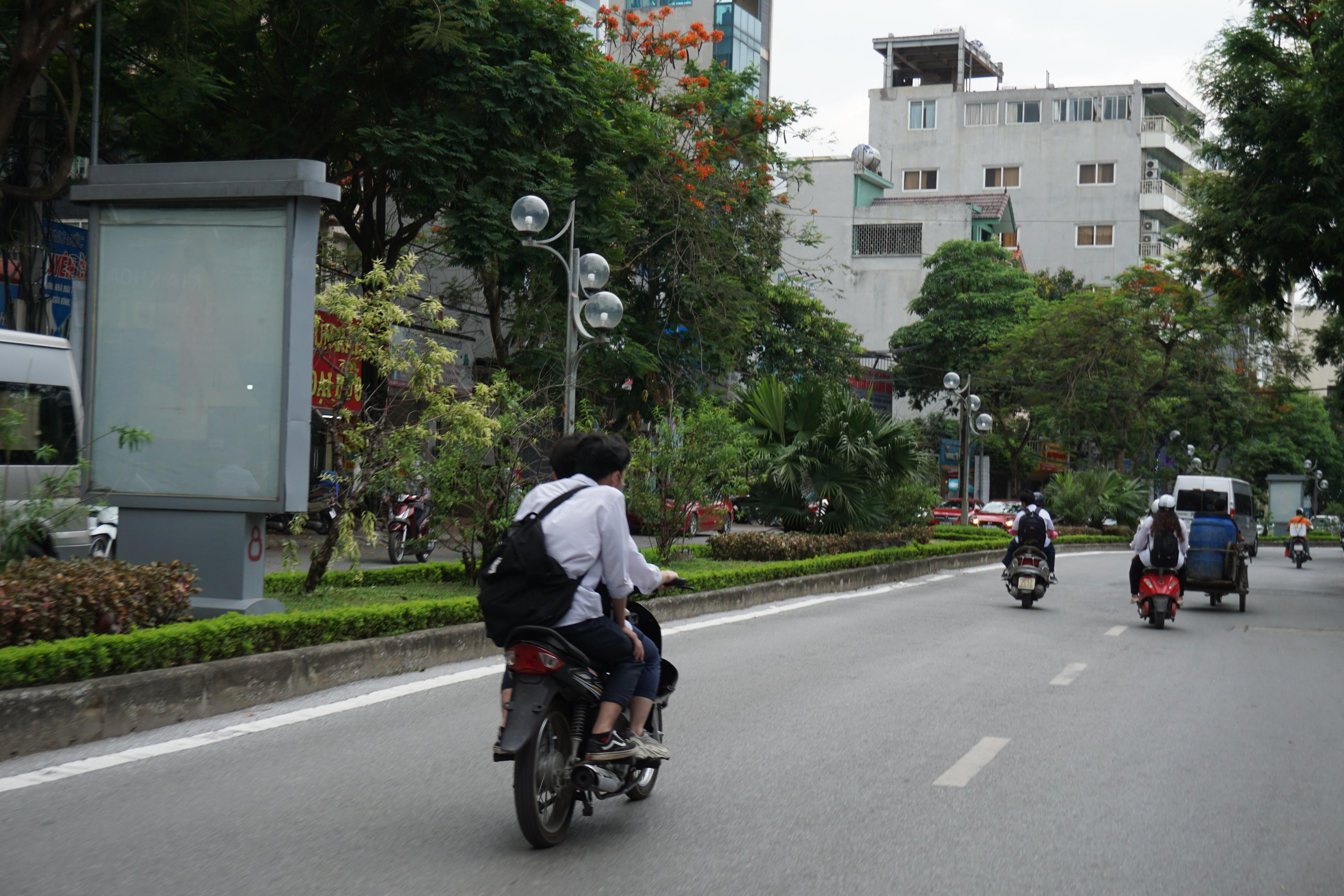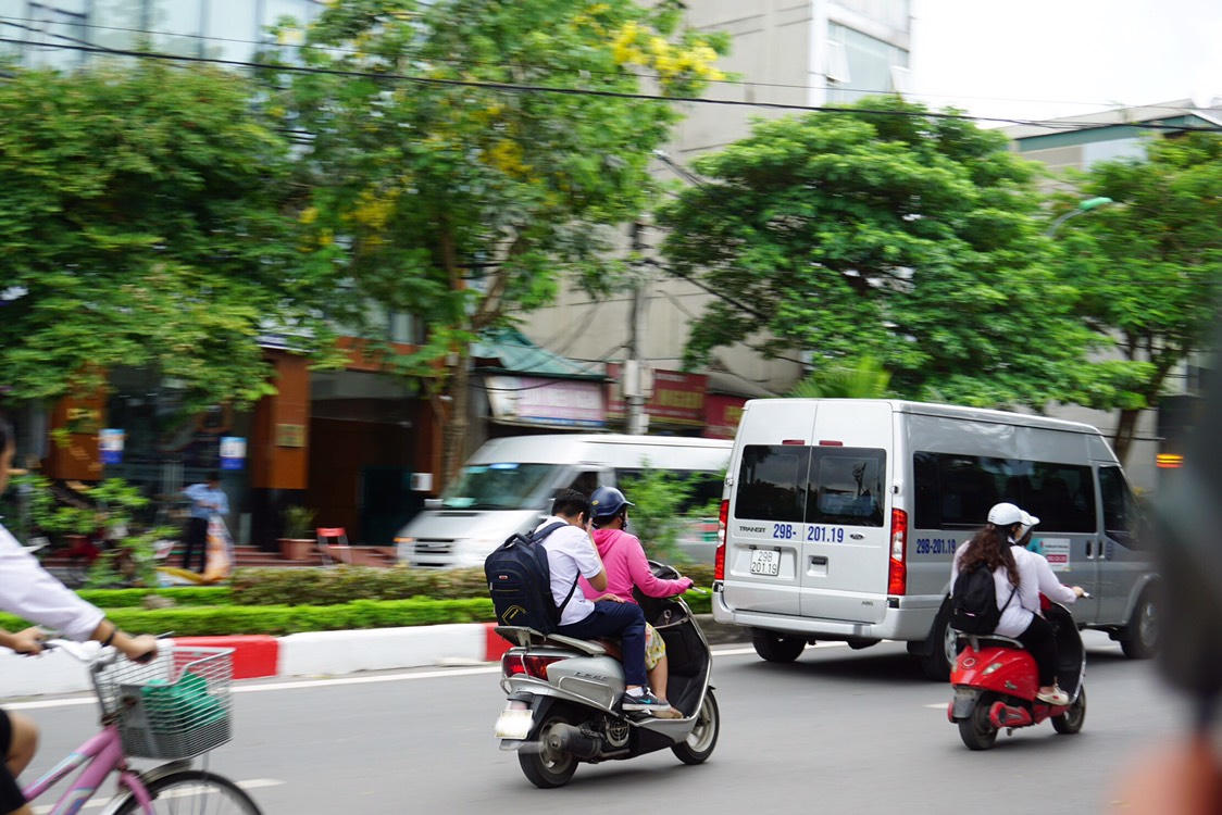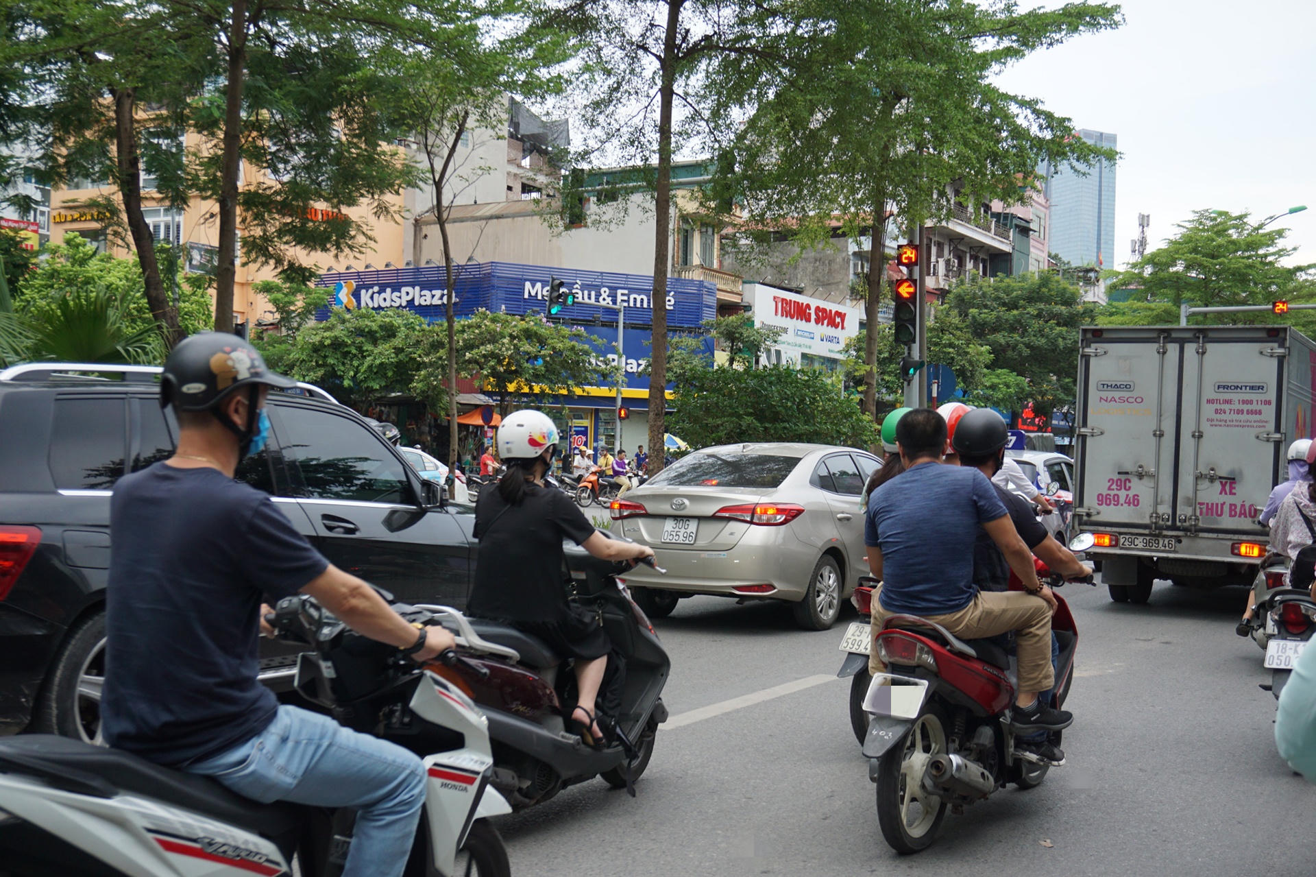 Cả người điều khiển và người ngồi sau đều không đội mũ bảo hiểm khi tham gia giao thông tại nút giao Nguyễn Văn Huyên – Hoàng Quốc Việt
