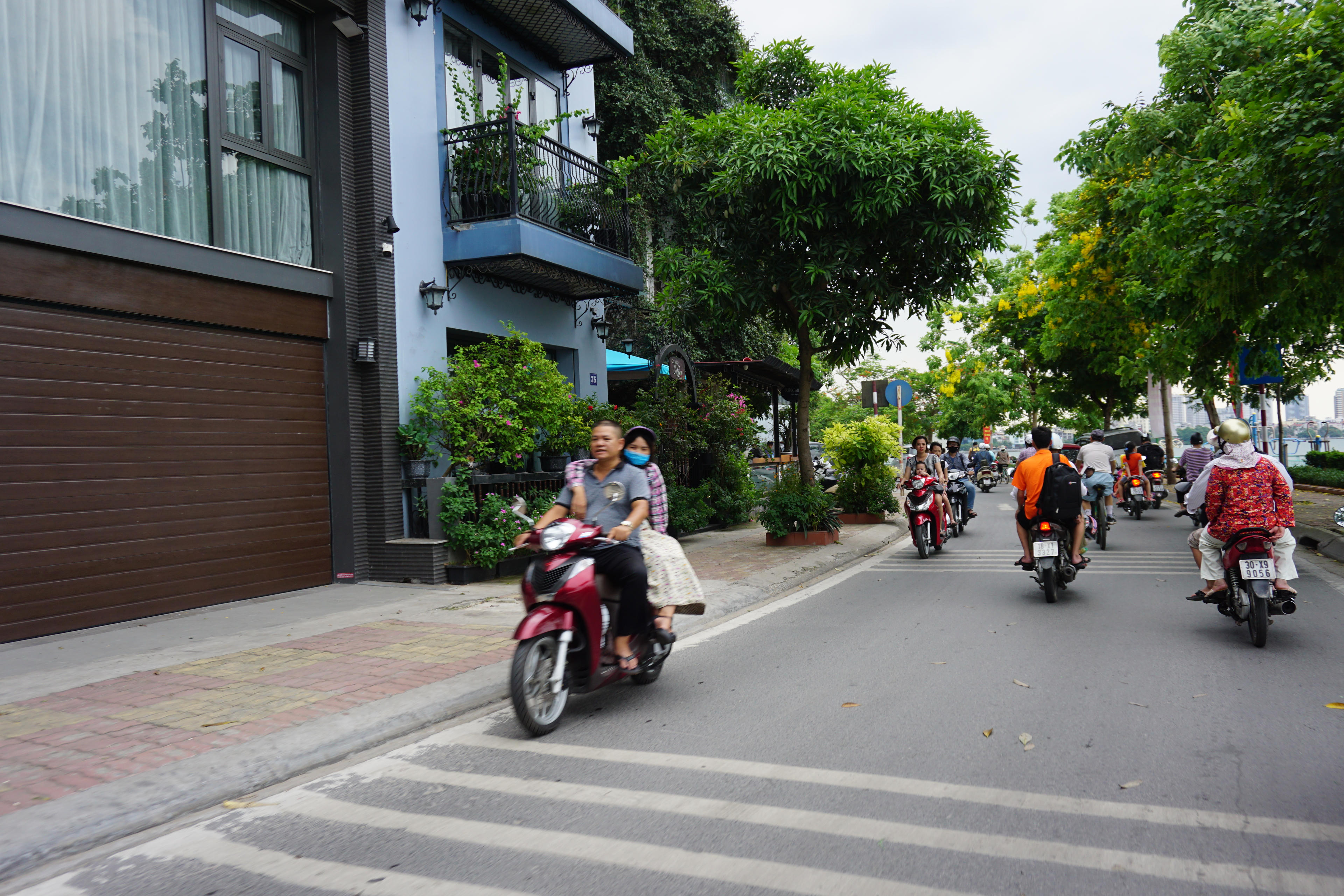Trên đường Nguyễn Đình Thi, nhiều người không ngần ngại tháo mũ bảo hiểm để "hóng gió" hồ Tây