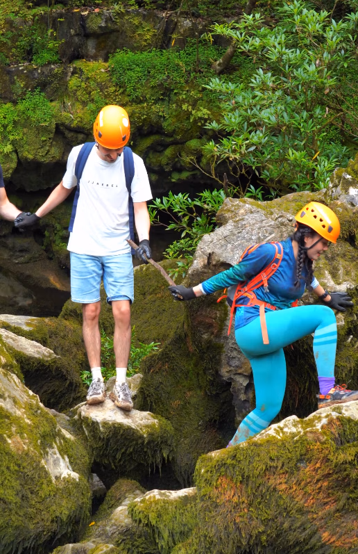 Nữ hướng dẫn viên cẩn thận hỗ trợ khách băng qua suối. Ảnh: Jungle Boss