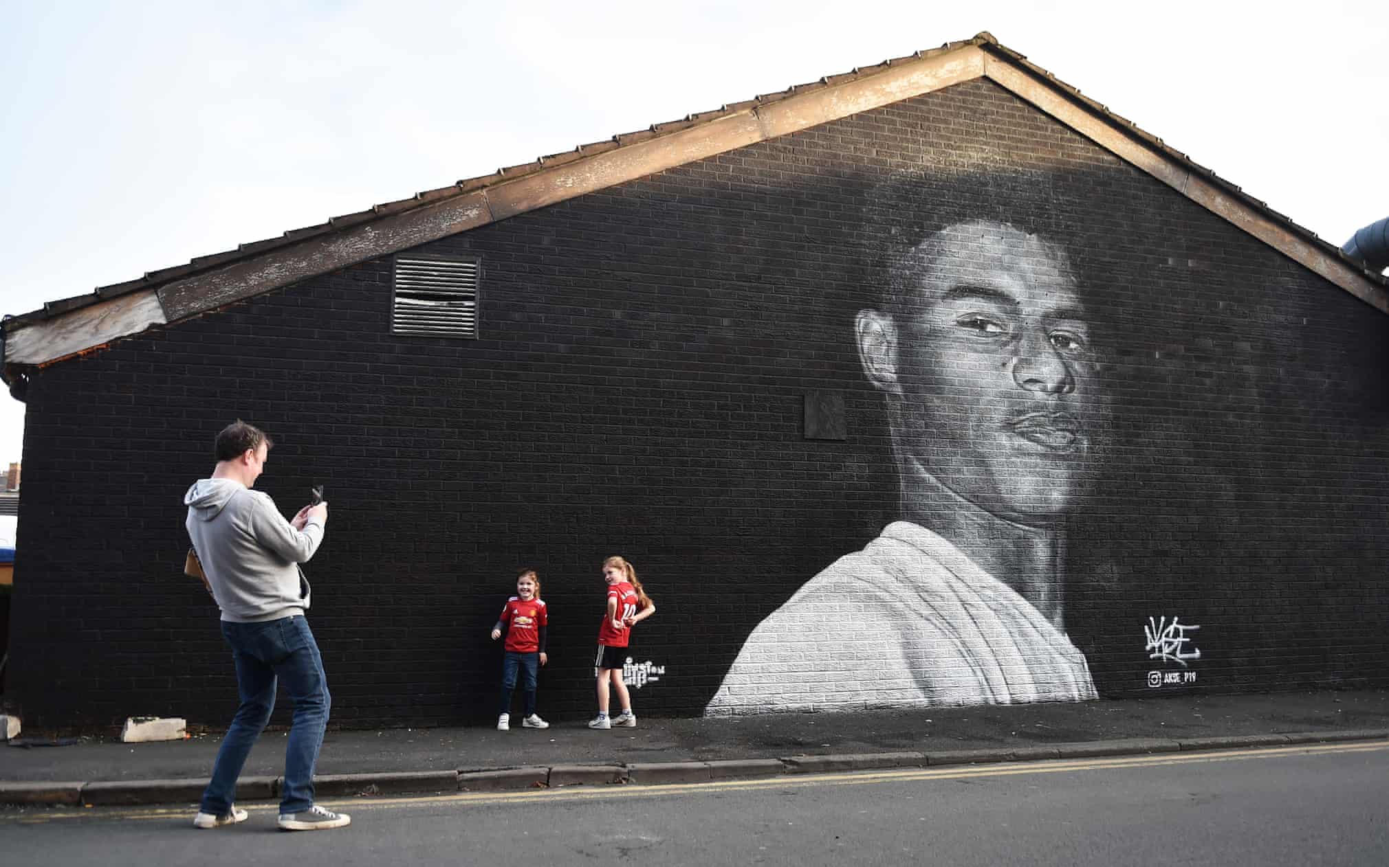 Hai cô gái chụp ảnh trước bức tranh tường của cầu thủ Marcus Rashford, sau khi cầu thủ bóng đá này nhận được Huân chương Đế quốc Anh cho công việc vận động chính phủ cung cấp bữa ăn cho trẻ em nghèo.