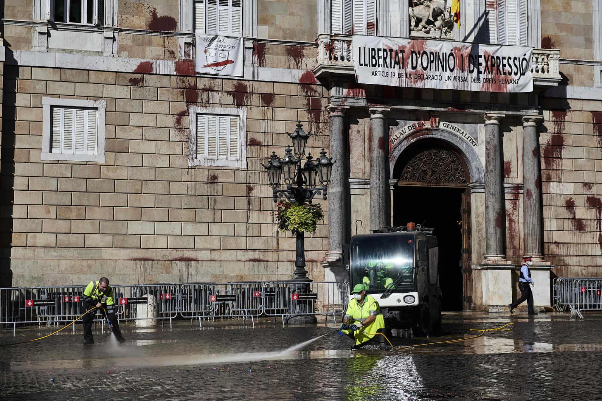 Hậu quả của một cuộc biểu tình chống lại các biện pháp giới hạn đề phòng ngừa Covid, trong đó Palau de la Generalitat bị ném đầy những quả bóng sơn.