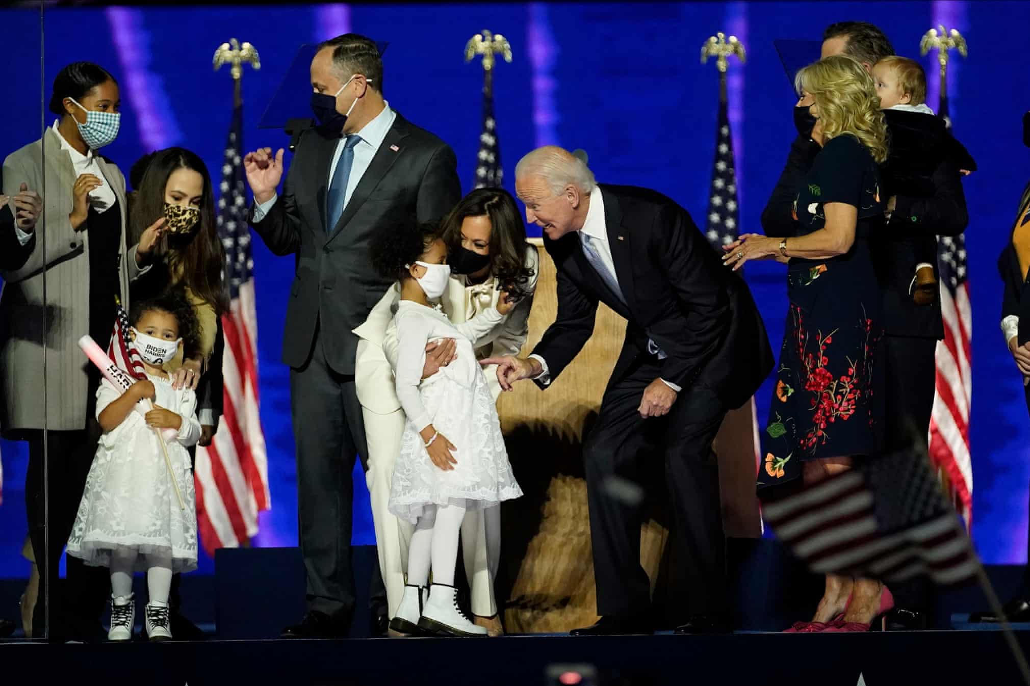Phó tổng thống đắc cử, Kamala Harris và tổng thống đắc cử, Joe Biden, ăn mừng trên sân khấu cùng gia đình tại một sự kiện được tổ chức bên ngoài Chase Center.