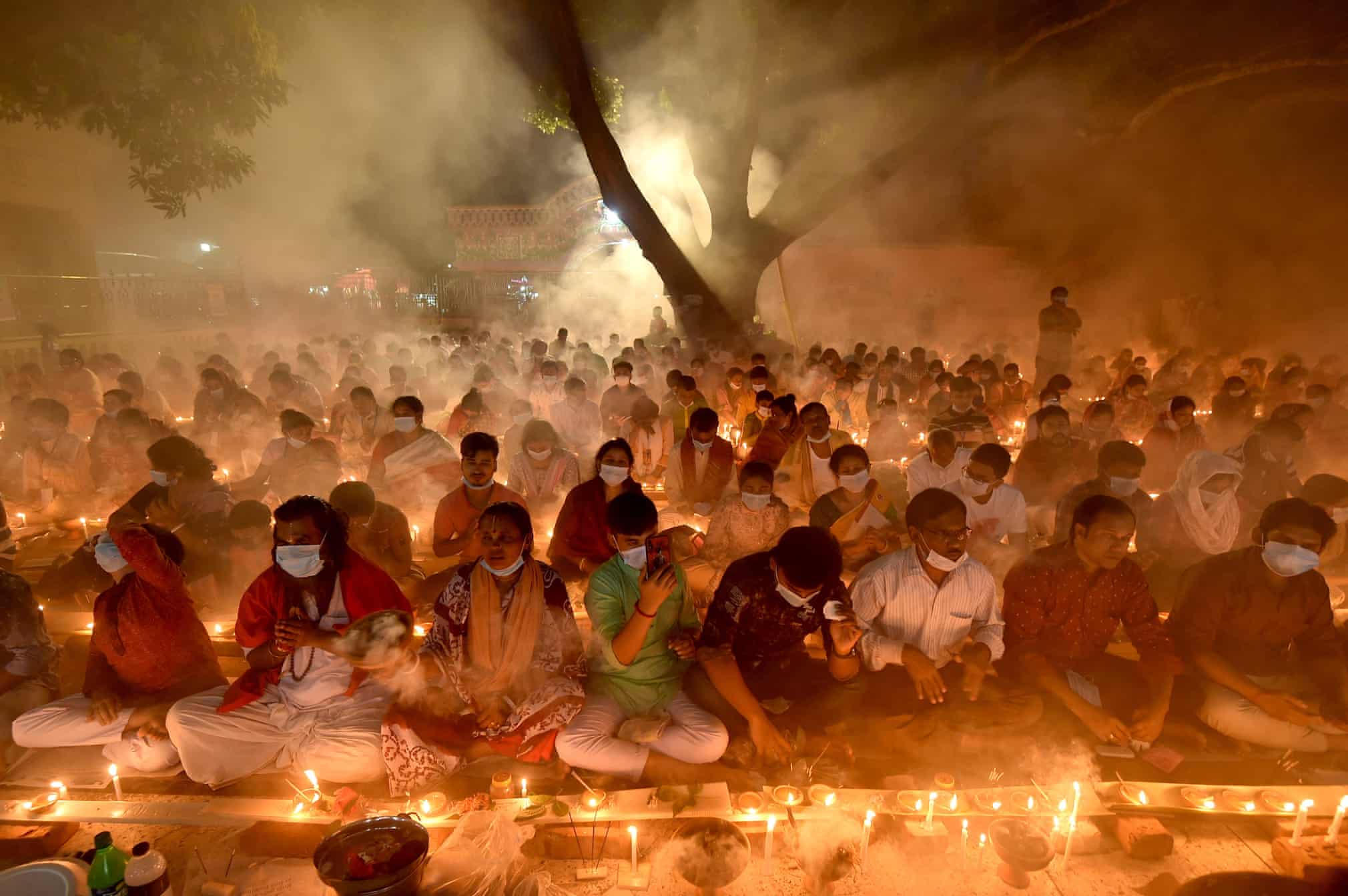 Những người sùng đạo Hindu cầu nguyện bằng cách đốt hương và thắp đèn dầu trong lễ hội ăn chay Rakher Upobash, tại một ngôi đền ở Narayanganj.