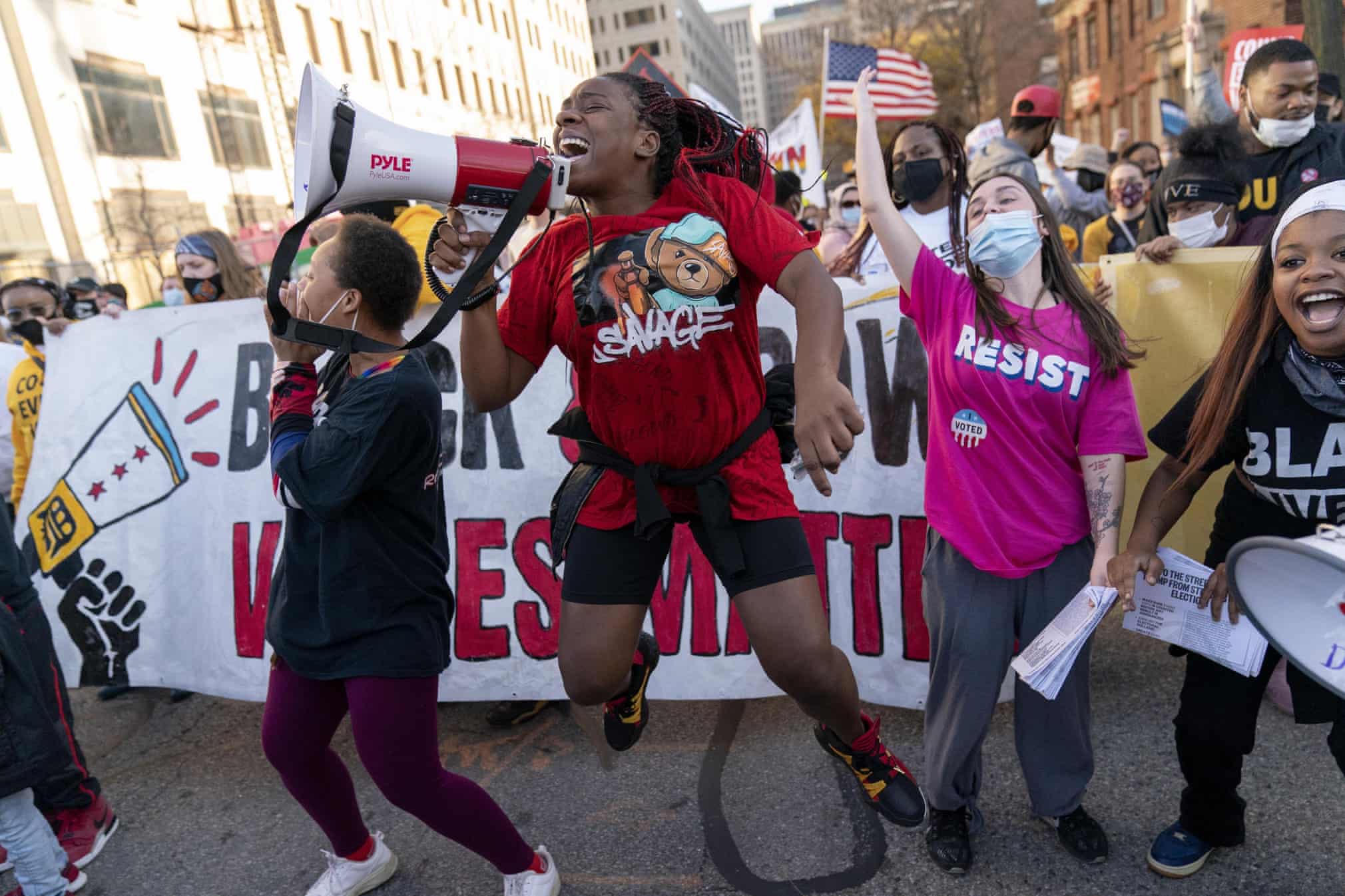Một phụ nữ da màu nhảy lên vì sung sướng khi ăn mừng chiến thắng của Joe Biden.