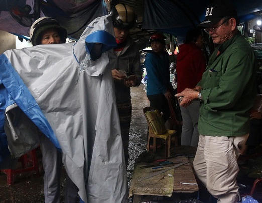 “Kinh nghiệm cả thôi. Làm cái nghề này ngót nghét cũng đã hơn 40 năm rồi còn gì”, người thợ già cười nhăn nheo, hiền lành rồi tiếp tục công việc. Không giống với ông Sĩ là dùng gần cùng loại với áo mưa được vá, ông Thuận lục trong đống đồ lỉnh kỉnh ra một đoạn nilông nhỏ màu trắng. Ông Thuận nói rằng đây là loại giấy gương đặc biệt dùng để dán áo mưa.