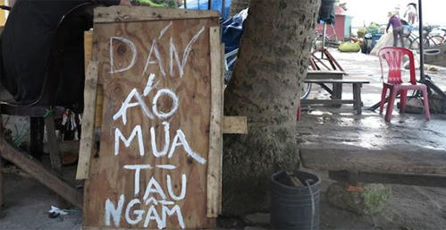 Tấm biển “Dán áo mưa tàu ngầm” ở phố cổ Hội An của chú Sỹ.