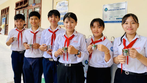 Em Bùi Hằng Ni (Trường THCS Huỳnh Tấn Phát) chia sẻ: “Em và các bạn rất vui vì giờ đây chỉ cần bước ra cửa lớp là có nước sạch để uống. Em xin hứa sẽ học tập thật tốt để không phụ lòng quan tâm và chăm sóc của mọi người”