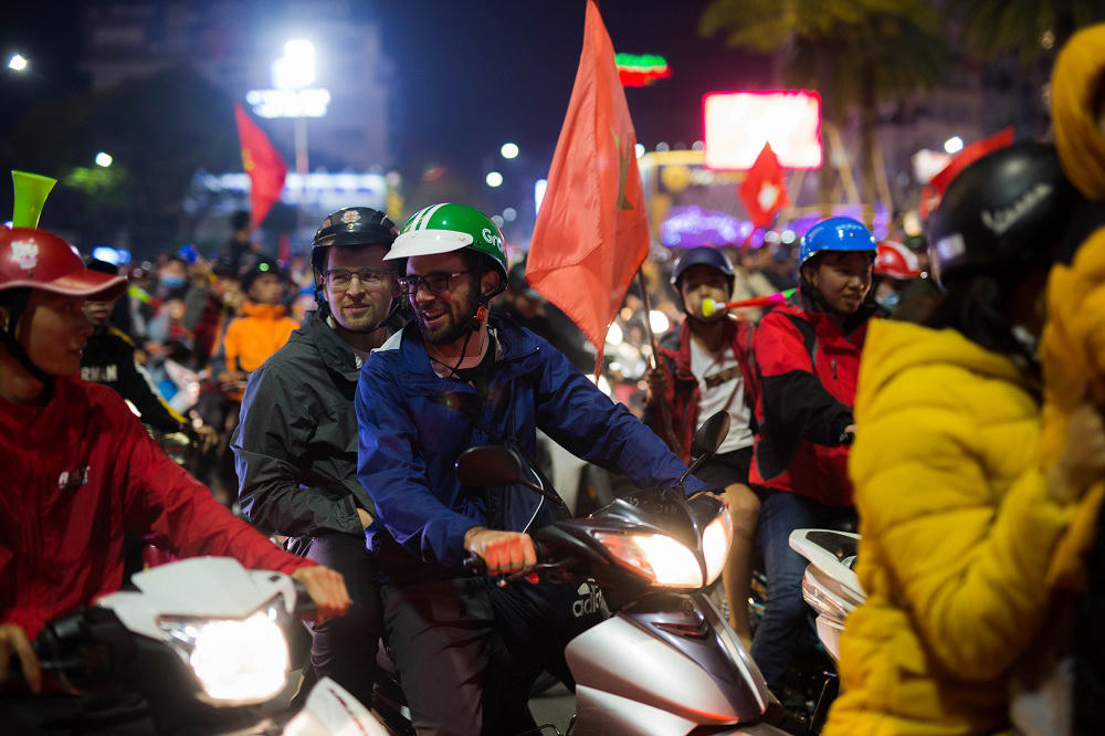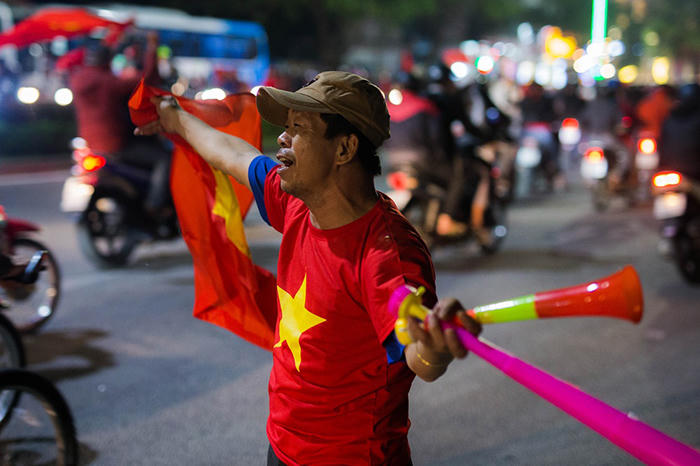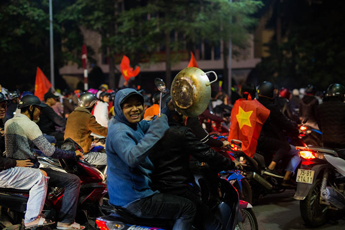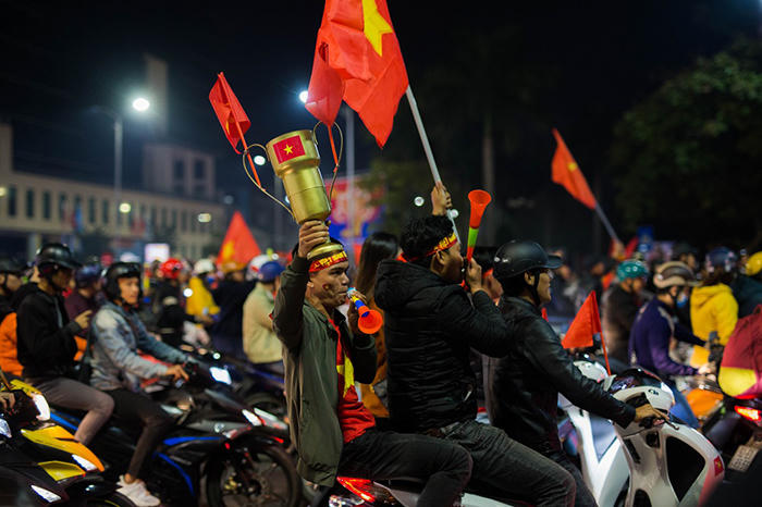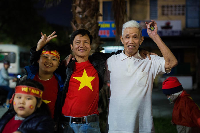 Từ người già cho đến trẻ nhỏ đều chung một niềm vui chiến thắng, cờ đỏ sao vàng đỏ rực khắp mọi nẻo đường thành phố Huế. Dù đêm Huế khá lạnh nhưng nhiều gia đình vẫn cho con nhỏ ra phố hòa chung niềm vui với người hâm mộ Việt Nam