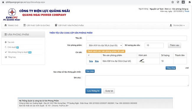 Bên cạnh việc gieo thói quen tốt về việc sử dụng tiết kiệm văn phòng phẩm thì Công ty cũng đẩy mạnh việc áp dụng giải pháp sáng kiến để tối ưu hoá chi phí. Trong đó, giải pháp quản lý công tác và cấp phát văn phòng phẩm của Công ty được triển khai xây dựng từ năm 2017 đã phát huy hiệu quả rõ rệt. Với ứng dụng này, các phòng ban và đơn vị trực thuộc được khoán chi phí hằng Quý và chủ động trong công tác đăng ký mua sắm văn phòng phẩm.