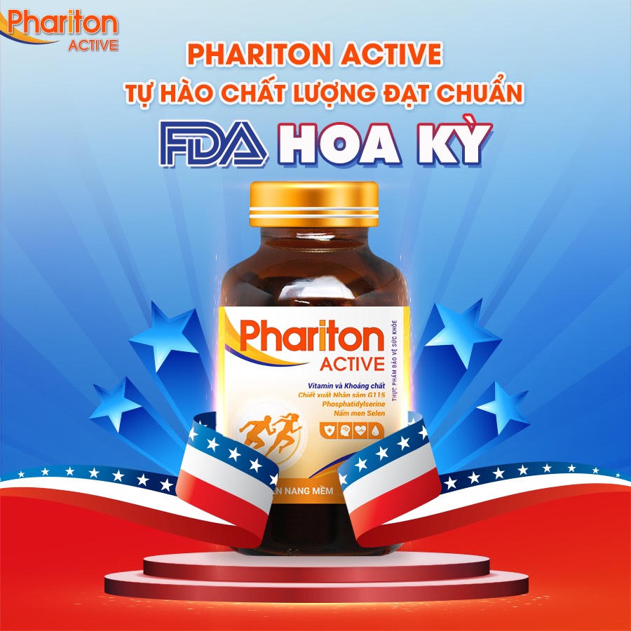 Phariton ACTIVE thuộc số ít dòng sản phẩm chức năng bổ trợ dinh dưỡng sản xuất trong nước có chất lượng đạt chứng nhận của FDA - Food and Drug Administration (Cục quản lý Thực phẩm và Dược phẩm Hoa Kỳ), trực thuộc Bộ Y tế và Nhân sinh Hoa Kỳ.