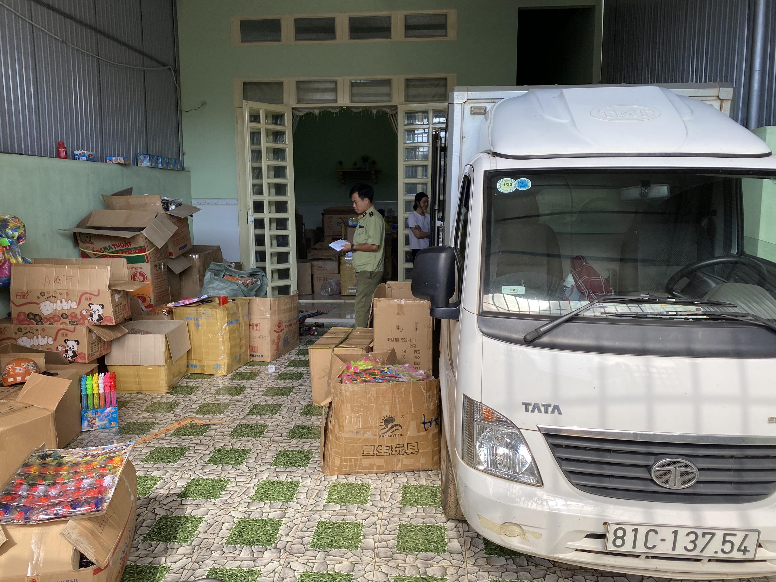 Lực lượng chức năng phát hiện trong kho thứ nhất có chứa 3.558 sản phẩm đồ chơi trẻ em gồm: 770 súng đồ chơi, kiếm nhựa 1.108 cái, 1.260 cung tên, 120 bút lase, 300 xe đồ chơi xuất xứ Trung Quốc.